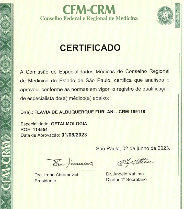 Quais são as principais especialidades de Flávia De Albuquerque Furlani .?Flávia De Albuquerque Furlani . é oftalmologista. Te mostramos alguns dos serviços oferecidos pelo especialista graças à sua trajetória e vasta experiência: Primeira consulta Oftalmologia.