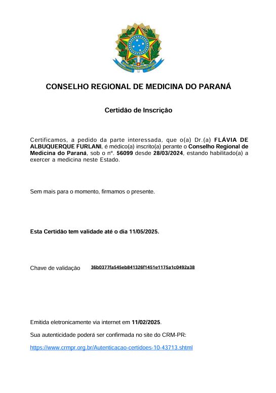 Você já passou por consulta com Dra. Flávia De Albuquerque Furlani .? Conte aqui como foi. Outros pacientes vão te agradecer por ajudá-los a escolher o melhor especialista.