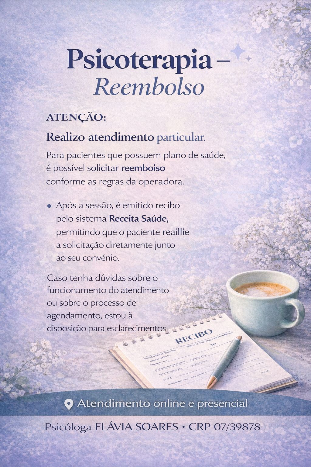 Sou psicóloga clínica e realizo atendimentos voltados a adultos e jovens adultos, com base na Terapia Cognitivo-Comportamental (TCC) — abordagem reconhecida por sua eficácia no tratamento de diversas demandas emocionais e comportamentais.