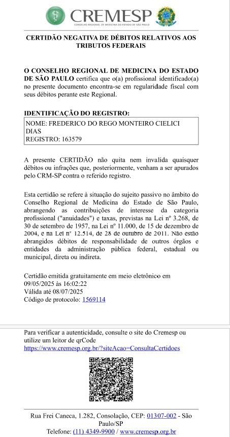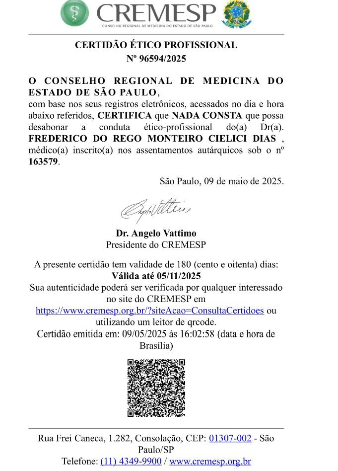 Posso passar por atendimento online com Frederico do Rego Monteiro Cielici Dias, sem ter que ir até o consultório?Sim, Frederico do Rego Monteiro Cielici Dias oferece atendimento online. Basta selecionar "Teleconsulta" ao agendar sua consulta e você poderá ver as datas e horários disponíveis.