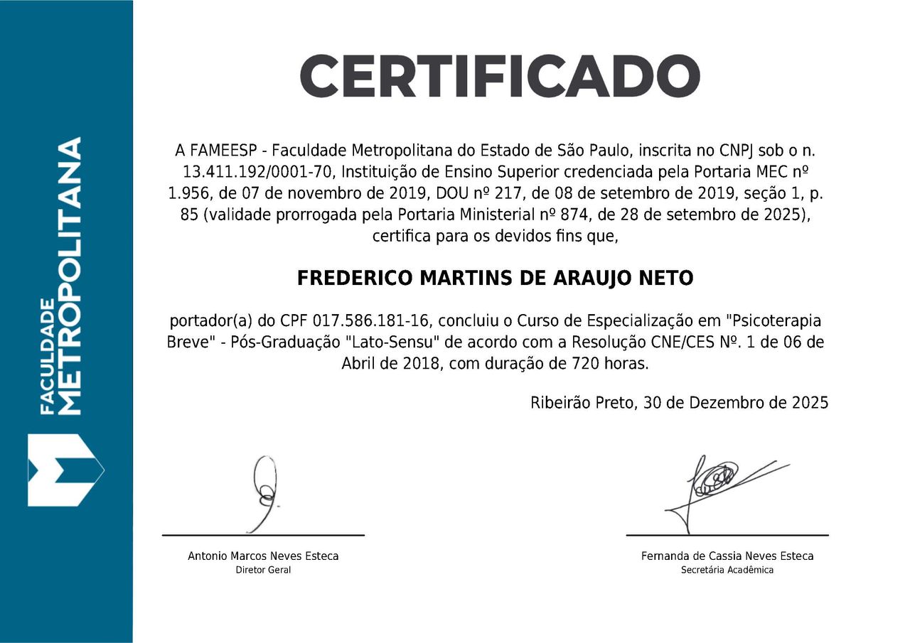 Quais são as principais especialidades de Frederico Martins De Araújo Neto?Frederico Martins De Araújo Neto é psiquiatra. Te mostramos alguns dos serviços oferecidos pelo especialista graças à sua trajetória e vasta experiência: Primeira consulta Psiquiatria, Tratamento da ansiedade, Anamnese psicológica, Tratamento da esquizofrenia e outros transtornos psicóticos, Tratamento da depressão, Tratamento em transtorno obsessivo compulsivo (TOC), Tratamento de transtorno afetivo bipolar, Manutenção de tratamento, Consulta psiquiátrica de acompanhamento por telemedicina, Tratamentos de fobias.