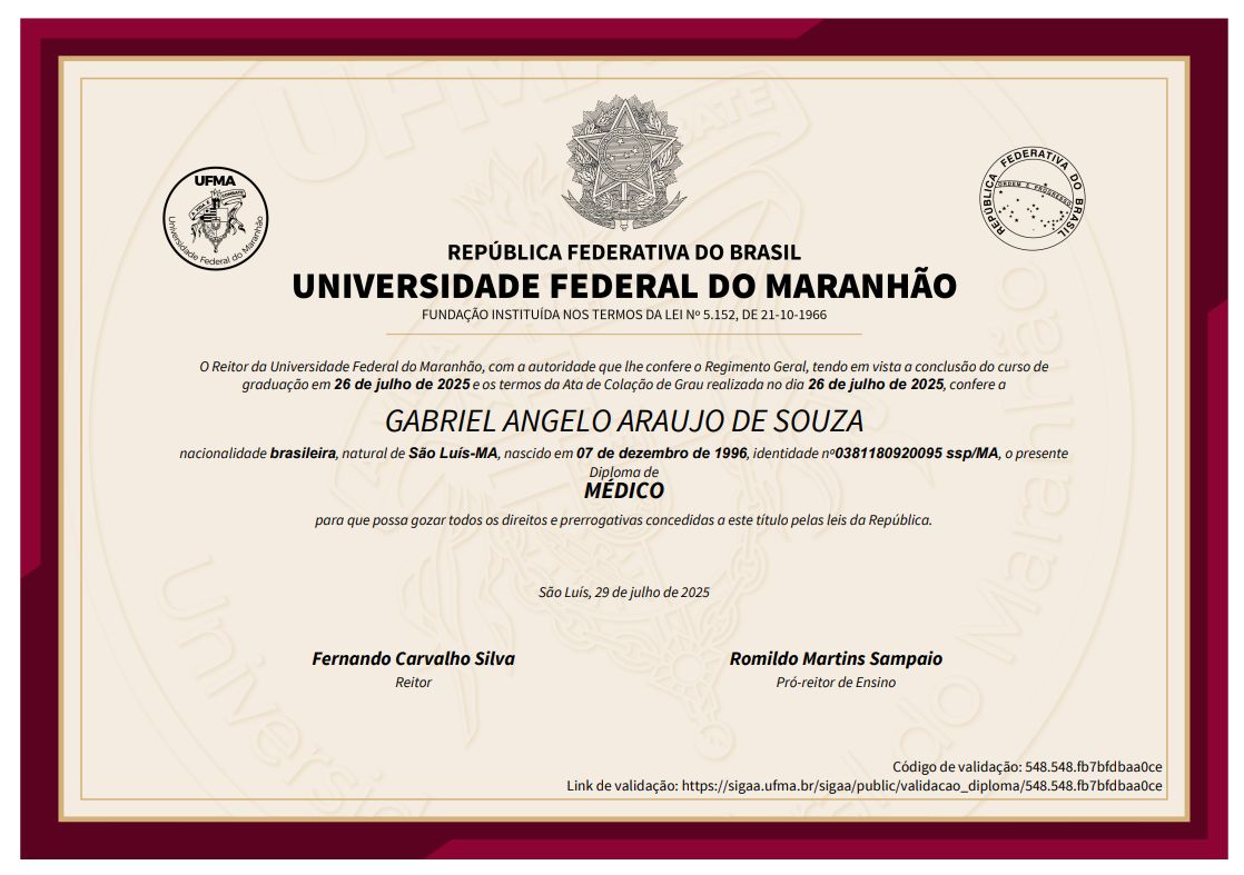 Sou médico formado pela Universidade Federal do Maranhão (UFMA), com conclusão da graduação em 2025 e registro no CRM/MA nº 16420.