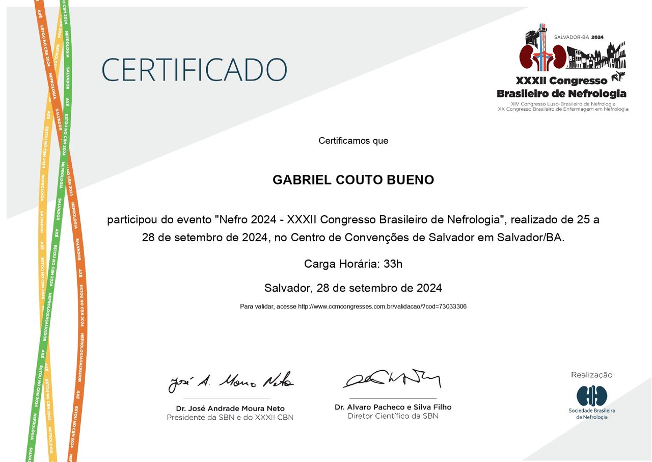Quais são as principais especialidades de Gabriel Bueno?Gabriel Bueno é nefrologista. Te mostramos alguns dos serviços oferecidos pelo especialista graças à sua trajetória e vasta experiência: Teleconsulta, Primeira consulta Nefrologia, Atendimento domiciliar, Consulta clínica médica, Tratamento para Hipertensão, Consulta Nefrologia, Diálise Peritoneal e Hemodiálise, Tratamento de infecção do trato urinário, Investigação metabólica da formação de calculos renais, Hemodiálise.