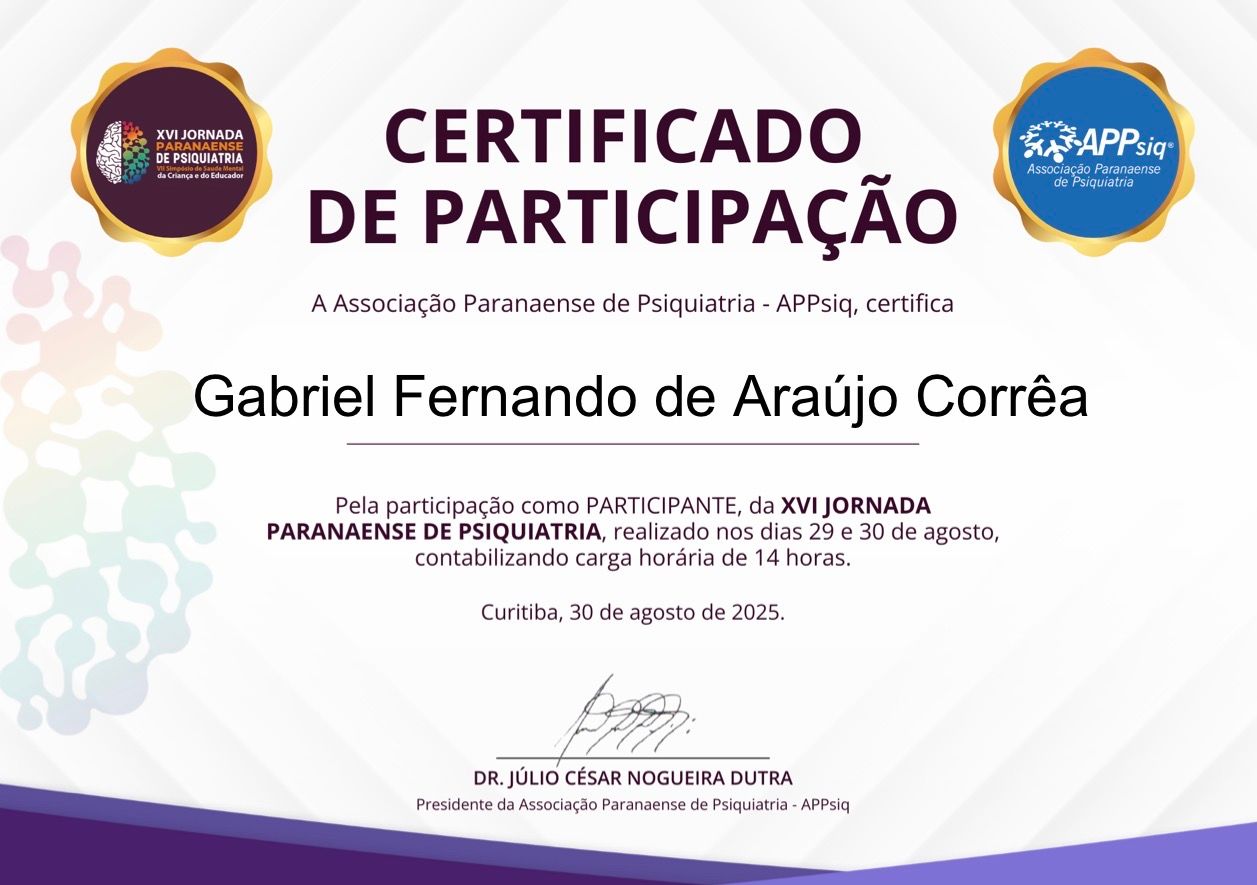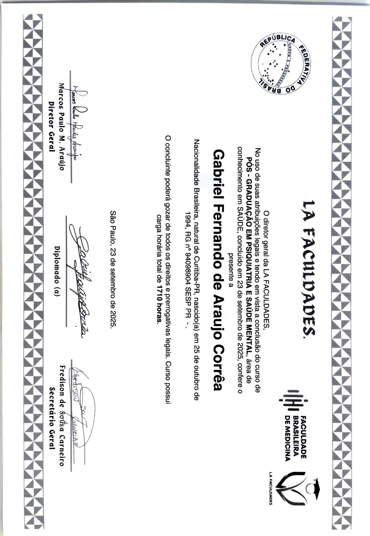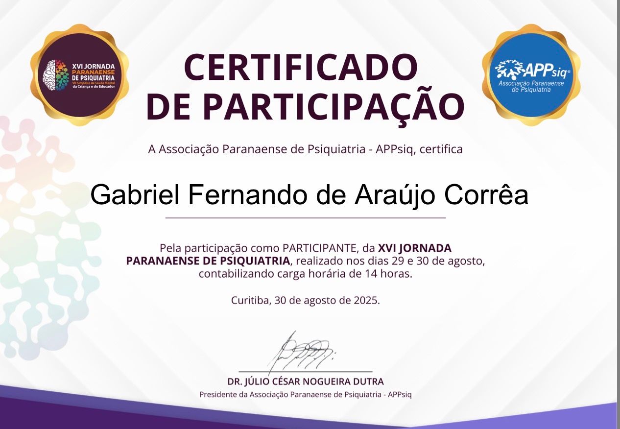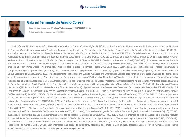 Sou Médico De Família E Comunidade - Membro Da Sociedade Brasileira De Medicina De Família E Comunidade E Associação Brasileira E Paranaense De Psiquiatria; Pós-Graduado Em Psiquiatria E Saúde Mental Pela Faculdade Brasileira De Medicina (SP, 2025) E Em Saúde Mental Com Ênfase Na Atenção Primaria De Saúde Pela Escola De Saúde Pública Do Paraná(SESA, 2023);