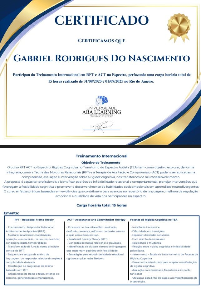 O Gabriel é um excelente profissional. Sempre carinhoso e cuidadoso com meu filho. Além do tratamento que é personalizado de acordo com o comportamento da semana, tendo total contato com a família.