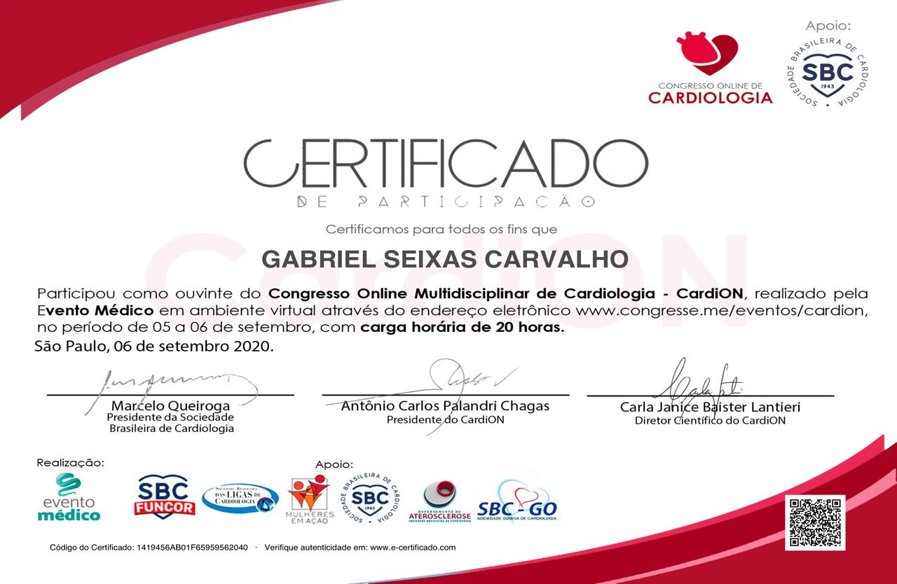 Quais são as principais especialidades de Gabriel Seixas Carvalho ?Gabriel Seixas Carvalho é cardiologista. Te mostramos alguns dos serviços oferecidos pelo especialista graças à sua trajetória e vasta experiência: Primeira consulta Cardiologia, Teleconsulta, Atendimento médico domiciliar, Check up, Retorno de consultas Cardiologia, Retorno de consultas por telemedicina, Consulta cardiologista, Prevenção cardiovascular, ECG (eletrocardiograma), Consulta+ECG.