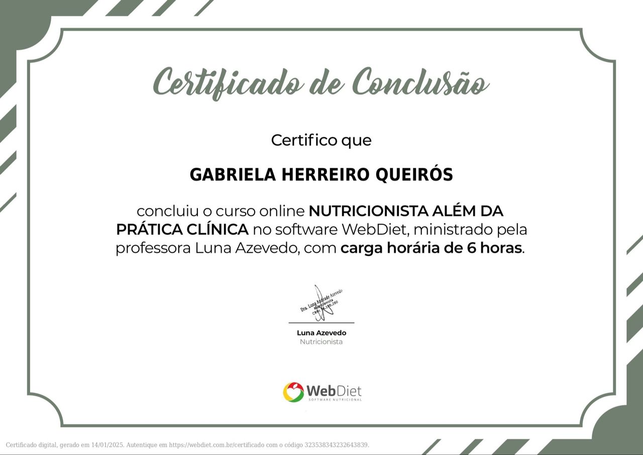 Quais são as principais especialidades de Gabriela Herreiro?Gabriela Herreiro é nutricionista. Te mostramos alguns dos serviços oferecidos pelo especialista graças à sua trajetória e vasta experiência: Teleconsulta, Acompanhamento nutricional, Atendimento online para brasileiros no exterior, Emagrecimento definitivo, Primeira consulta Nutrição, Consulta hipertrofia e definição muscular, Consulta de nutrição, Retorno de consultas Nutrição, Tratamento da ansiedade, Análise e solicitação de exames.