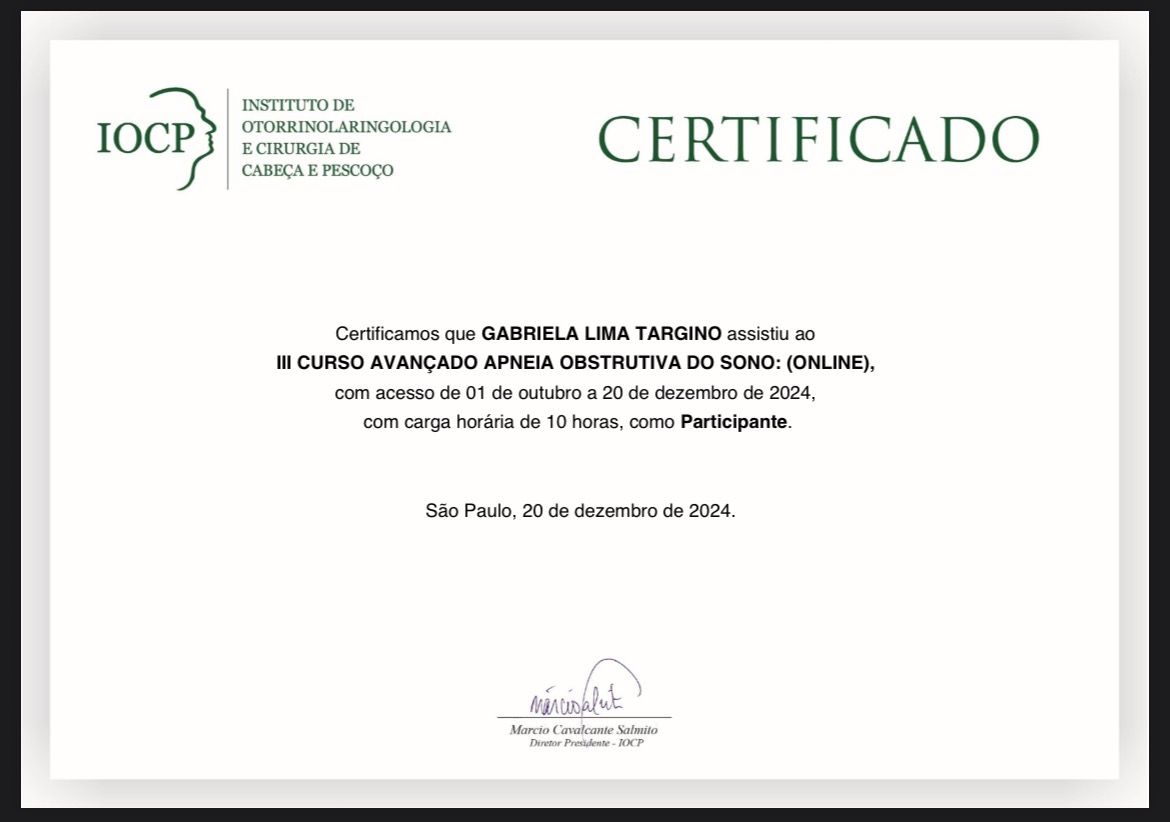 Quais são as principais especialidades de Gabriela Lima Targino ?Gabriela Lima Targino é médica do sono, otorrino. Te mostramos alguns dos serviços oferecidos pelo especialista graças à sua trajetória e vasta experiência: Teleconsulta, Polissonografia domiciliar, Consulta em Medicina do Sono, Primeira consulta com médico do sono, Tratamento para distúrbios do sono, Consulta medicina do sono, Tratamento de doenças respiratórias do sono, Teste domiciliar de apneia do sono, Polissonografia, Polissonografia domiciliar completa.