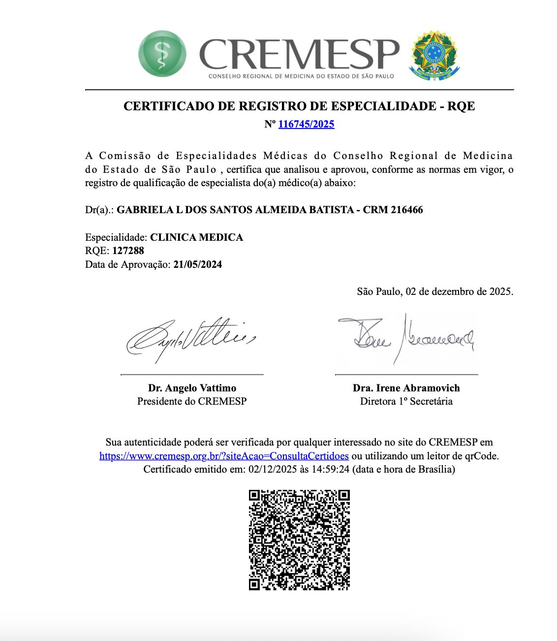 Consulta excelente! Estava com suspeita de Intolerancia a Lactose, porém nunca tinha investigado a fundo, a Dra Gabriela me diagnosticou e me tratou com excelencia! Além cuidar da minha irmã que tem o Sindrome do Intestino Irritavel!