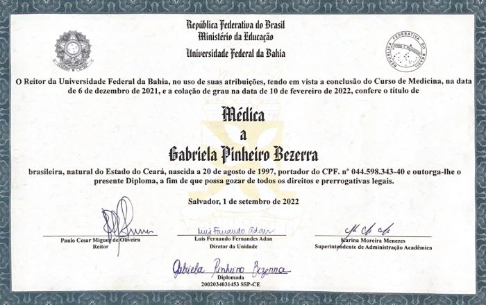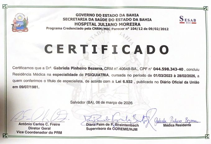 Sou médica formada pela Universidade Federal da Bahia, com residência em Psiquiatria pela Secretaria Estadual de Saúde da Bahia. Atualmente, estou em especialização em Dependência Química e Transtornos do Impulso pela Faculdade de Medicina da USP.