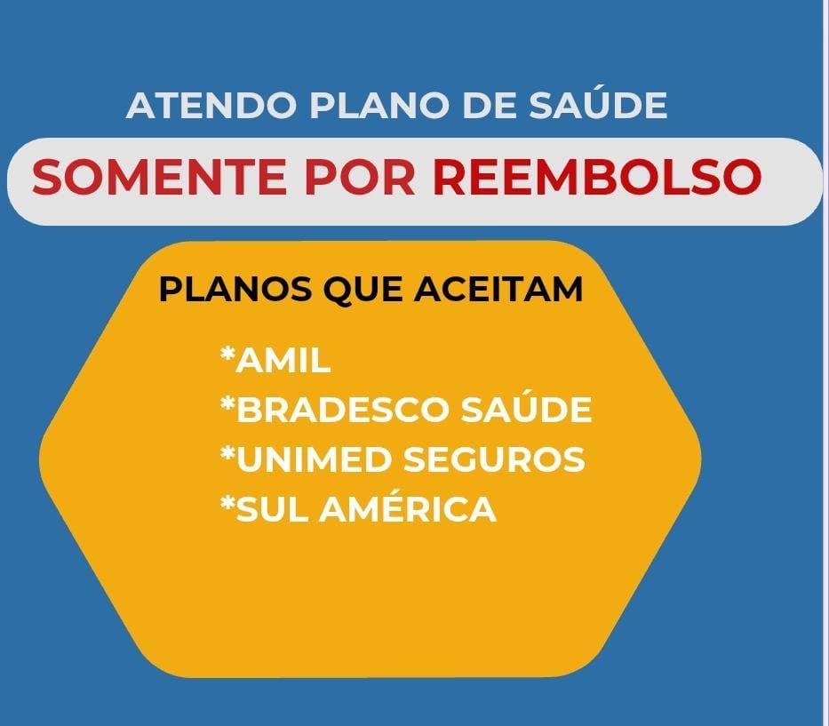 Atendo plano de saúde atráves do reembolso. Planos que aceitam: Amil, Bradesco Saúde, Unimed Seguros e Sul America.