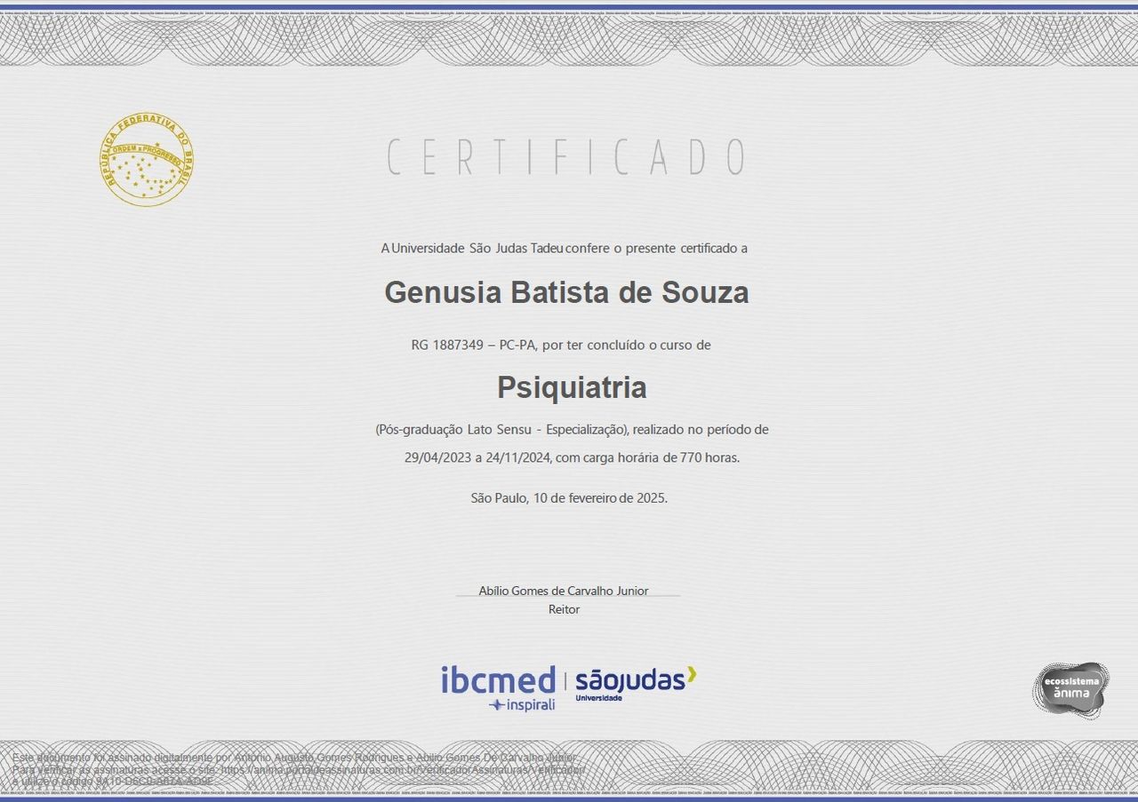 Sou a Dra. Genusia Batista, médica, CRM 216.318. Atuo principalmente na psiquiatria, área à qual dedico meu trabalho e minha escuta diária, aliando esse cuidado ao olhar integral da medicina de saúde da família.