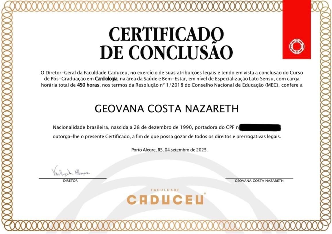 Quais são as principais especialidades de Geovana Costa Nazareth?Geovana Costa Nazareth é cardiologista. Te mostramos alguns dos serviços oferecidos pelo especialista graças à sua trajetória e vasta experiência: Primeira consulta Cardiologia, Emagrecimento, Bioimpedância, Consulta Cardiologia, ECG (eletrocardiograma), Ergoespirometria, Dinamometria isométrica, MAPA (Monitorização Ambulatorial de Pressão Arterial), Holter 24 horas, Termografia.