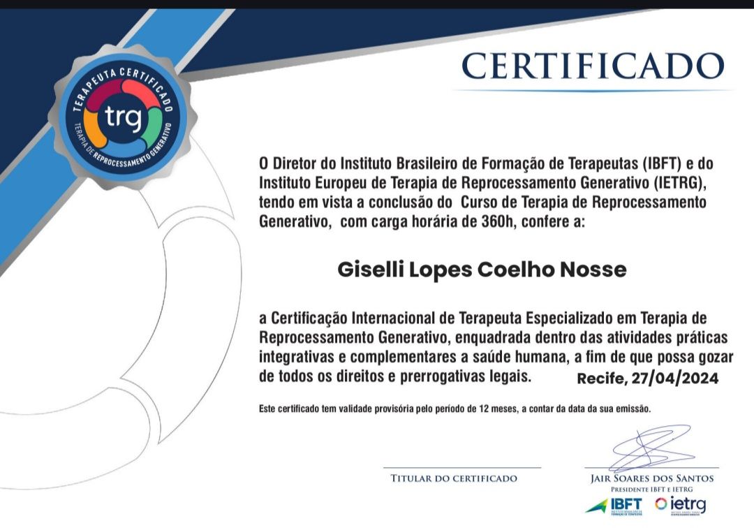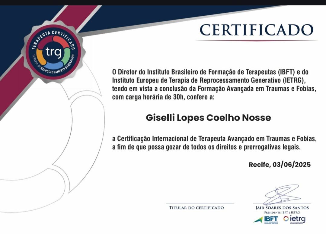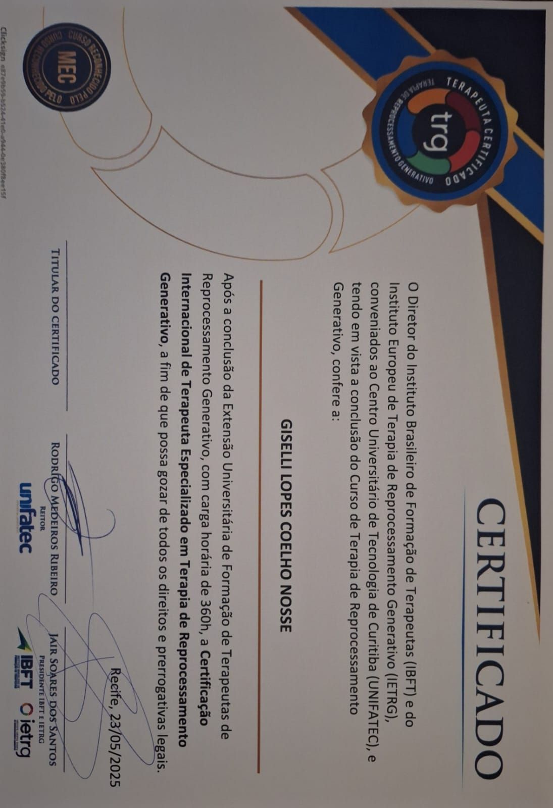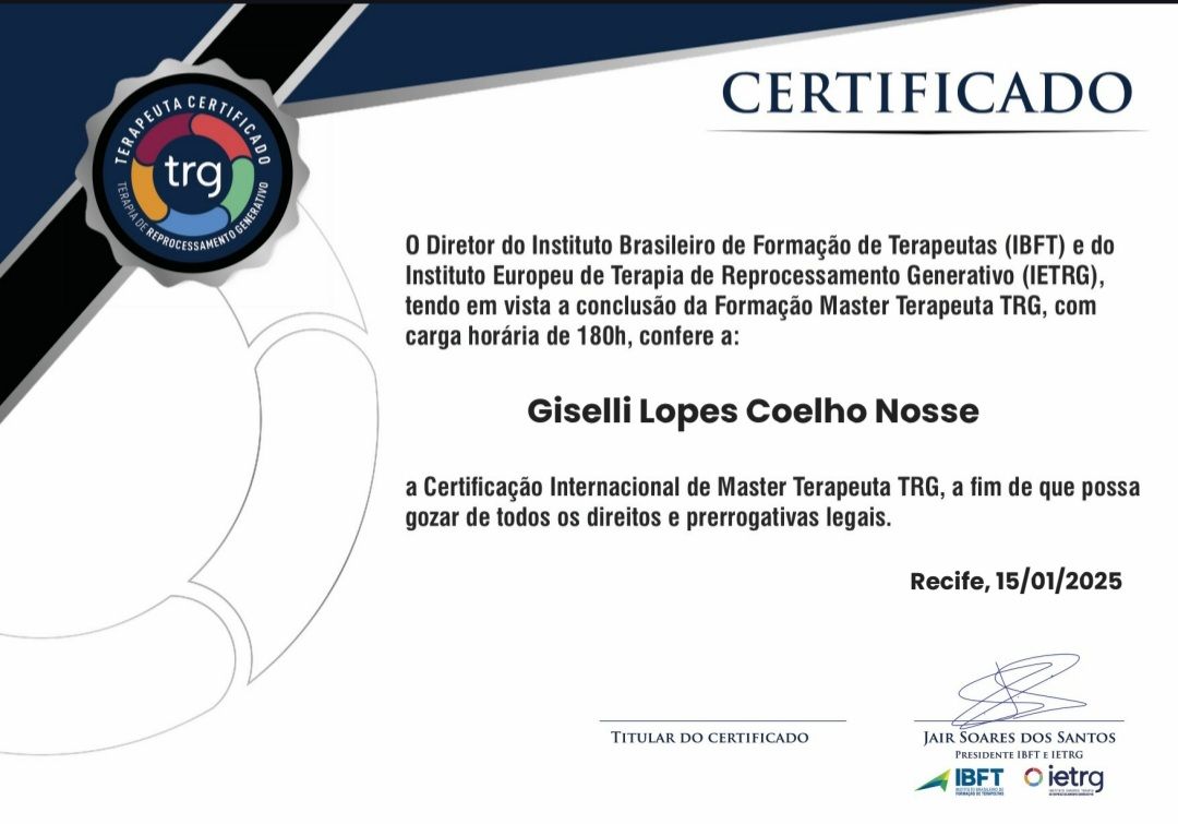 Atenciosamente Giselli Lopes Master Terapeuta TRG