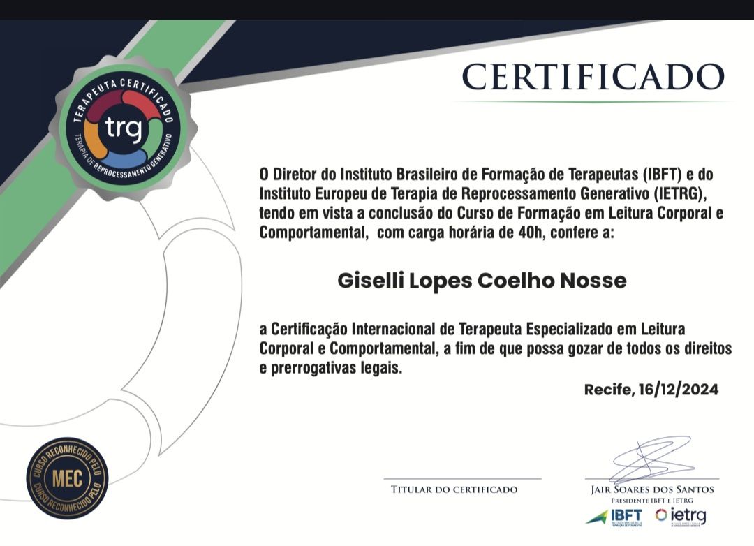 Olá eu sou Giselli Lopes Coelho Nosse, sou master terapeuta TRG e especialista em leitura corporal e comportamental.