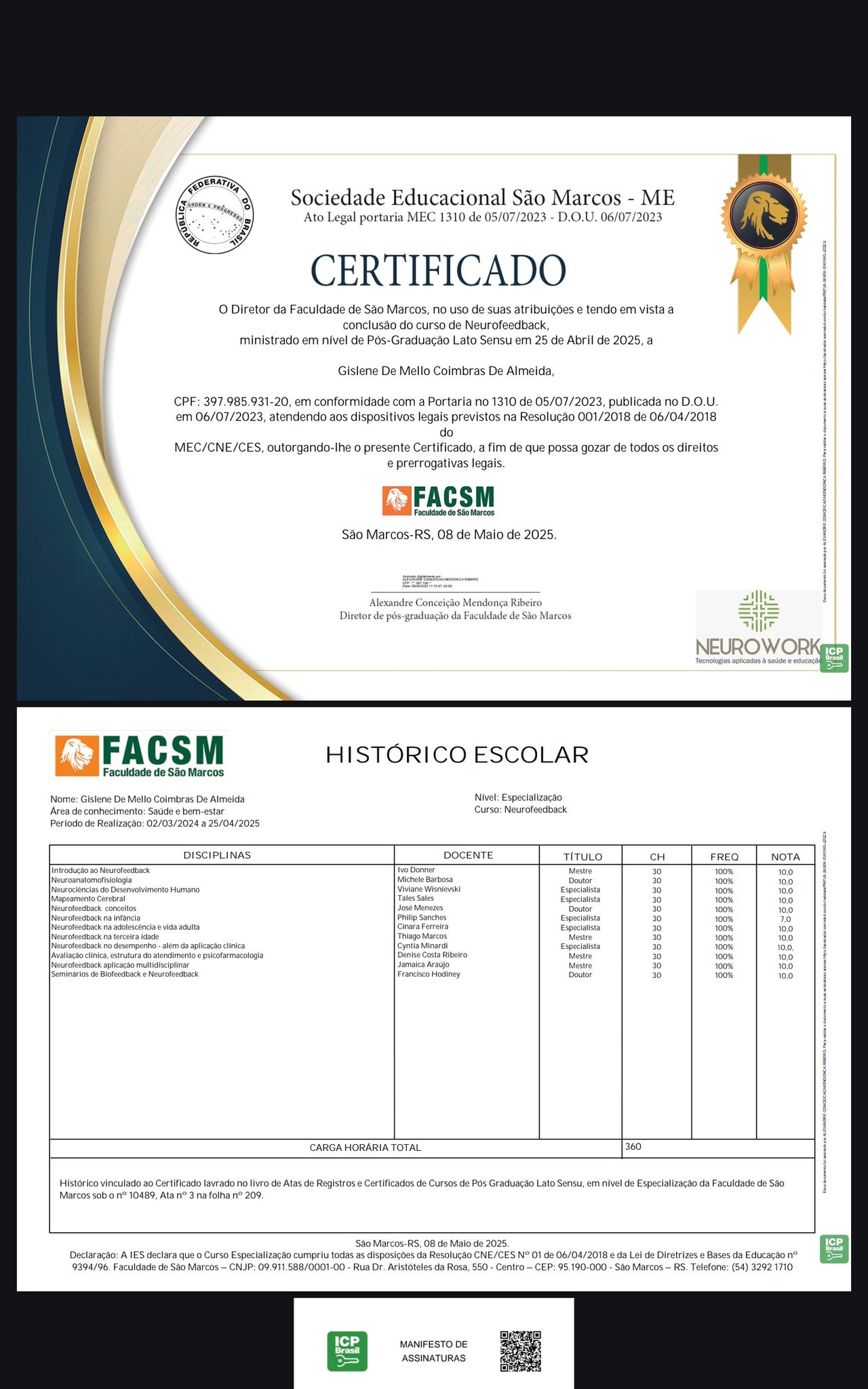 Seu treino de neurofeedback e neuromodulação foi para ambas um grande desafio devido á resistência percebida a certos medicamentos e até a técnica, porém, acredito na eficácia das técnicas utilizadas no seu caso, mas a sua determinação em melhorar ẹ sua adesão ao tratamento foi crucial para sua evolução. Obrigada minha querida por confiar em meu trabalho. Te desejo sucesso!
