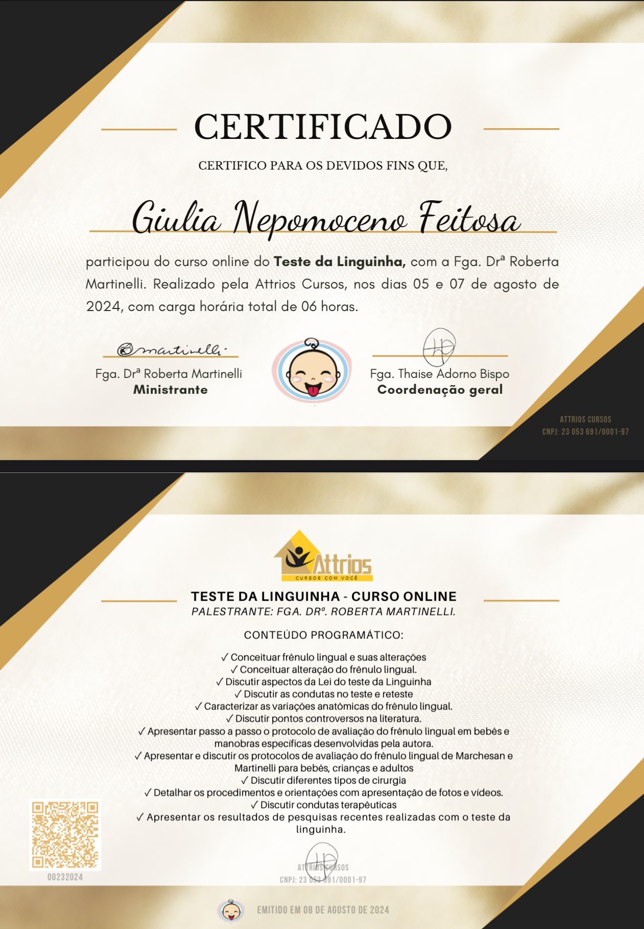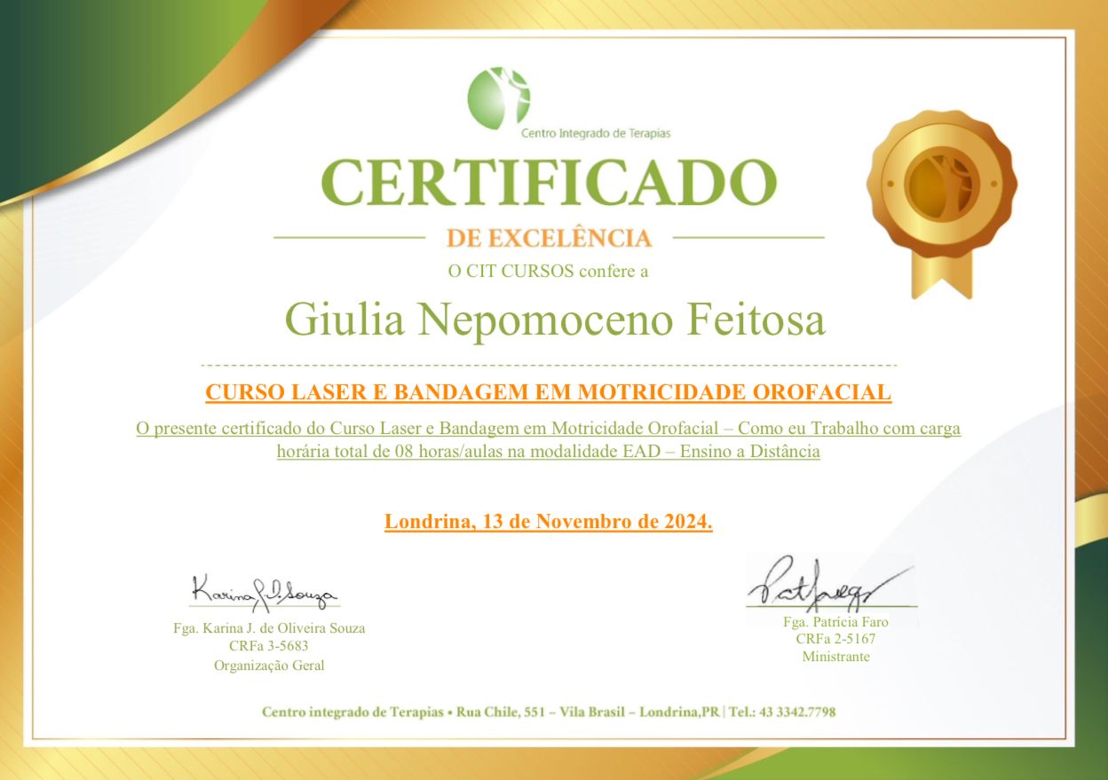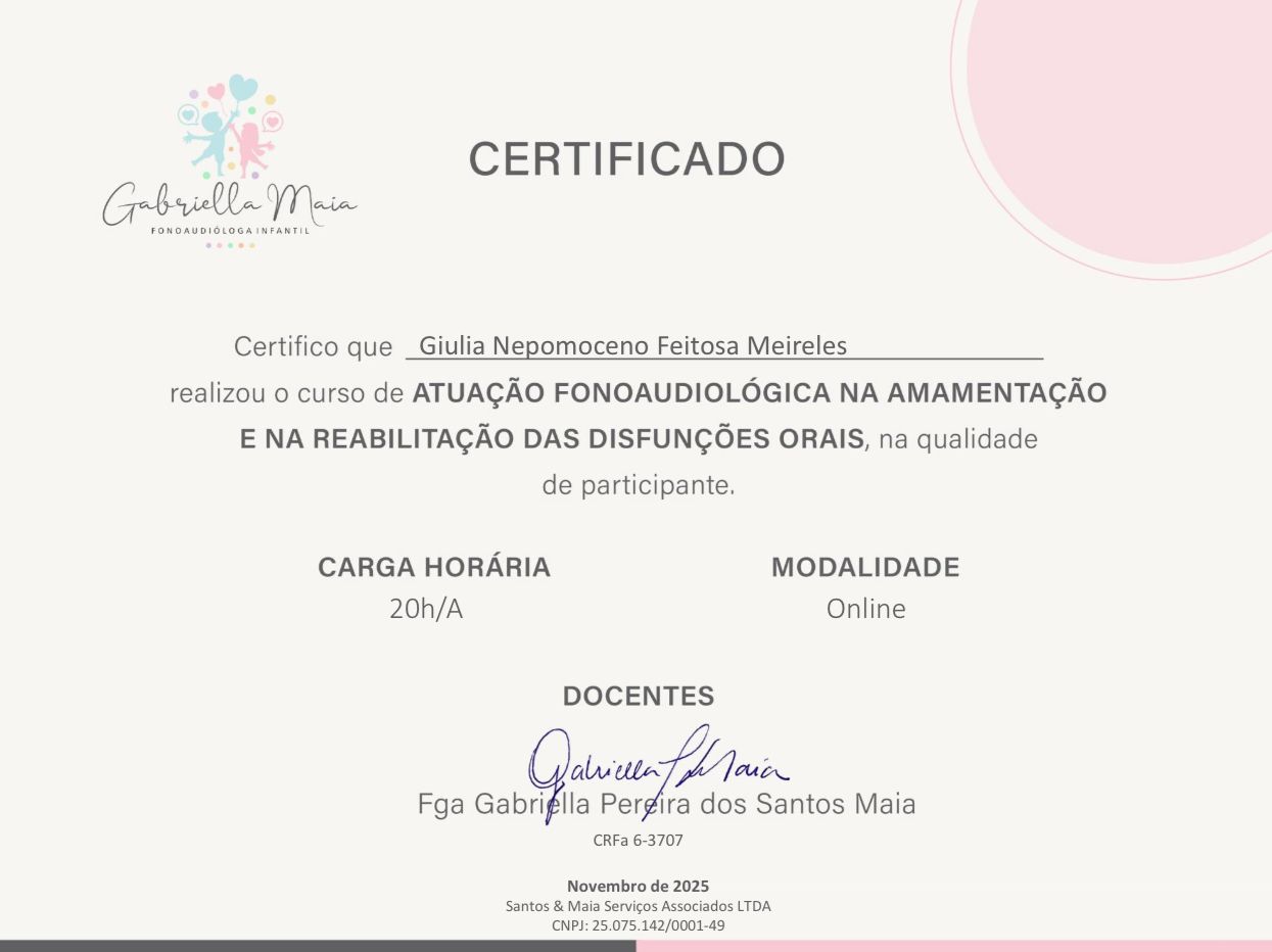 Sou pós-graduada em Distúrbios de Fala e Linguagem e pós-graduanda em Disfagia. Possuo certificações em linguagem, motricidade orofacial, transtornos fonológicos, teste da linguinha, atuação na amamentação e disfunções orais em bebês. Tenho experiência clínica e hospitalar.