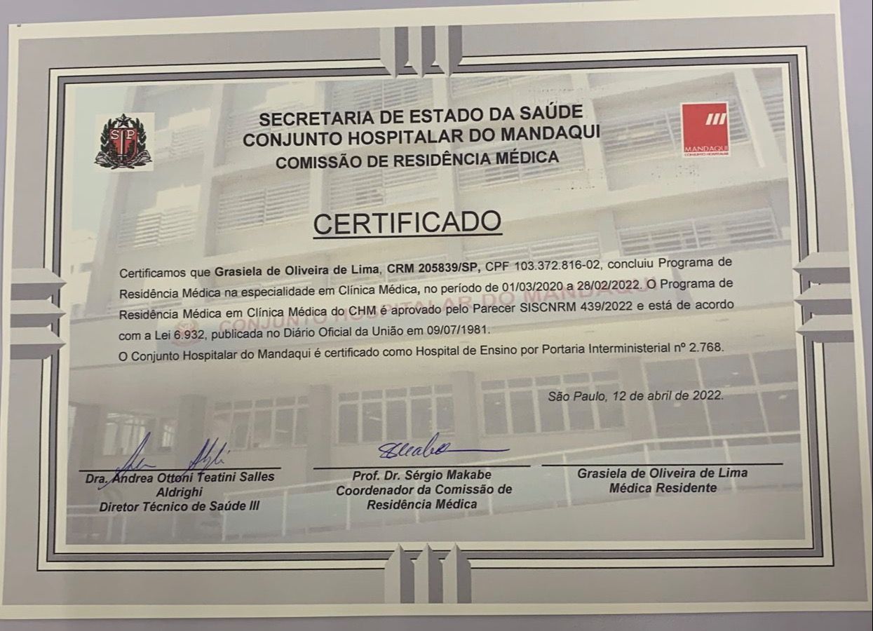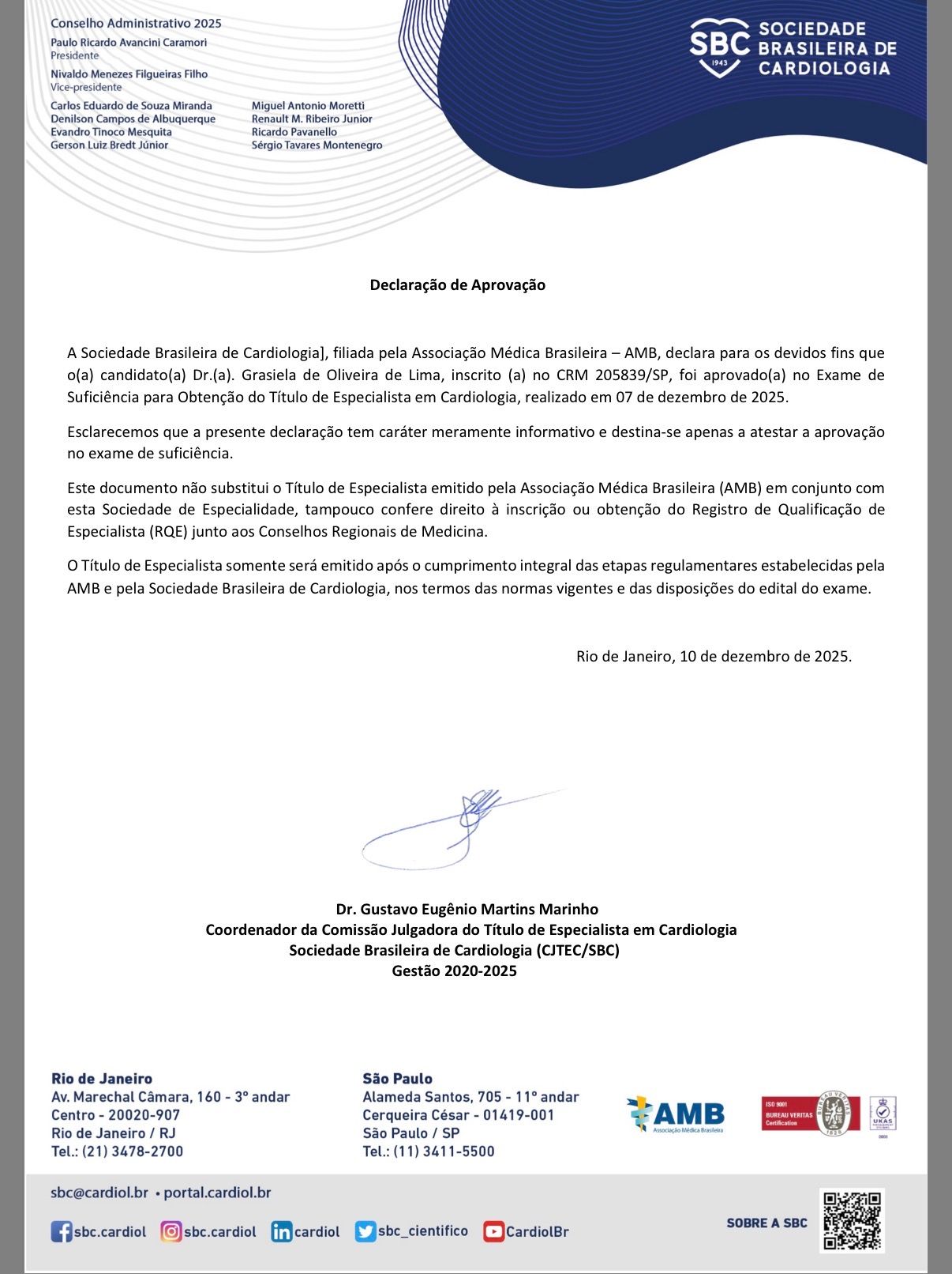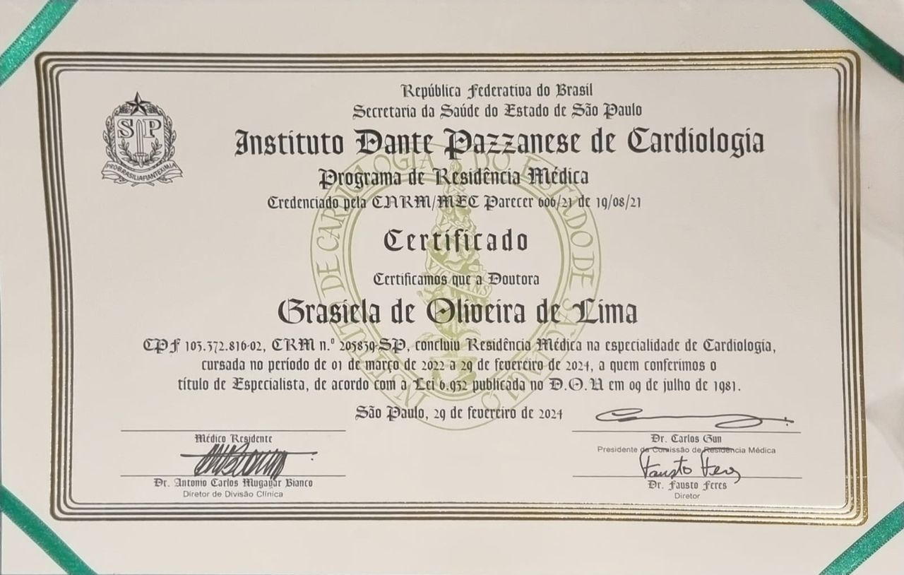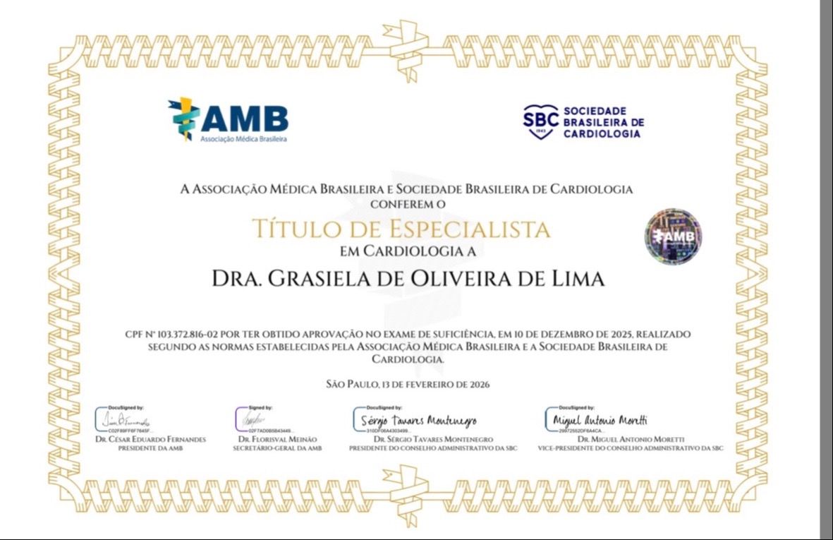 Seu profissionalismo é admirável. Ela explica todos os procedimentos de forma clara e compreensível.Sinto-me segura com a Dra. Grasiela, pois ela demonstra um profundo conhecimento na área de cardiologia.• CONSULTAS VIA TELEMEDICINA • Primeira consulta Cardiologia •