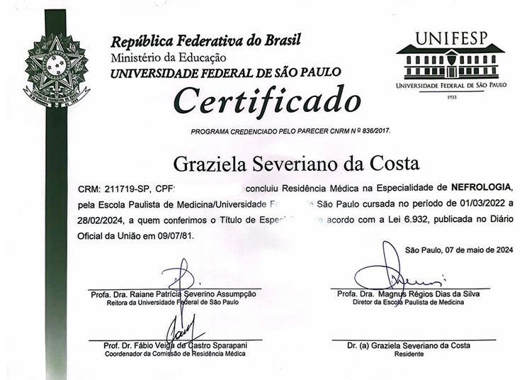 Quais são as principais especialidades de Graziela Severiano da Costa?Graziela Severiano da Costa é nefrologista. Te mostramos alguns dos serviços oferecidos pelo especialista graças à sua trajetória e vasta experiência: Primeira consulta Nefrologia, Tratamento de doença renal crônica, Tratamento de envelhecimento renal no idoso, Tratamento de insuficiência renal aguda, Tratamento para Hipertensão, Avaliação de cistos renais, Tratamento de hematúria, Tratamento para nefrolitíase, Tratamento para glomerulonefrite, Tratamento de proteinúria.