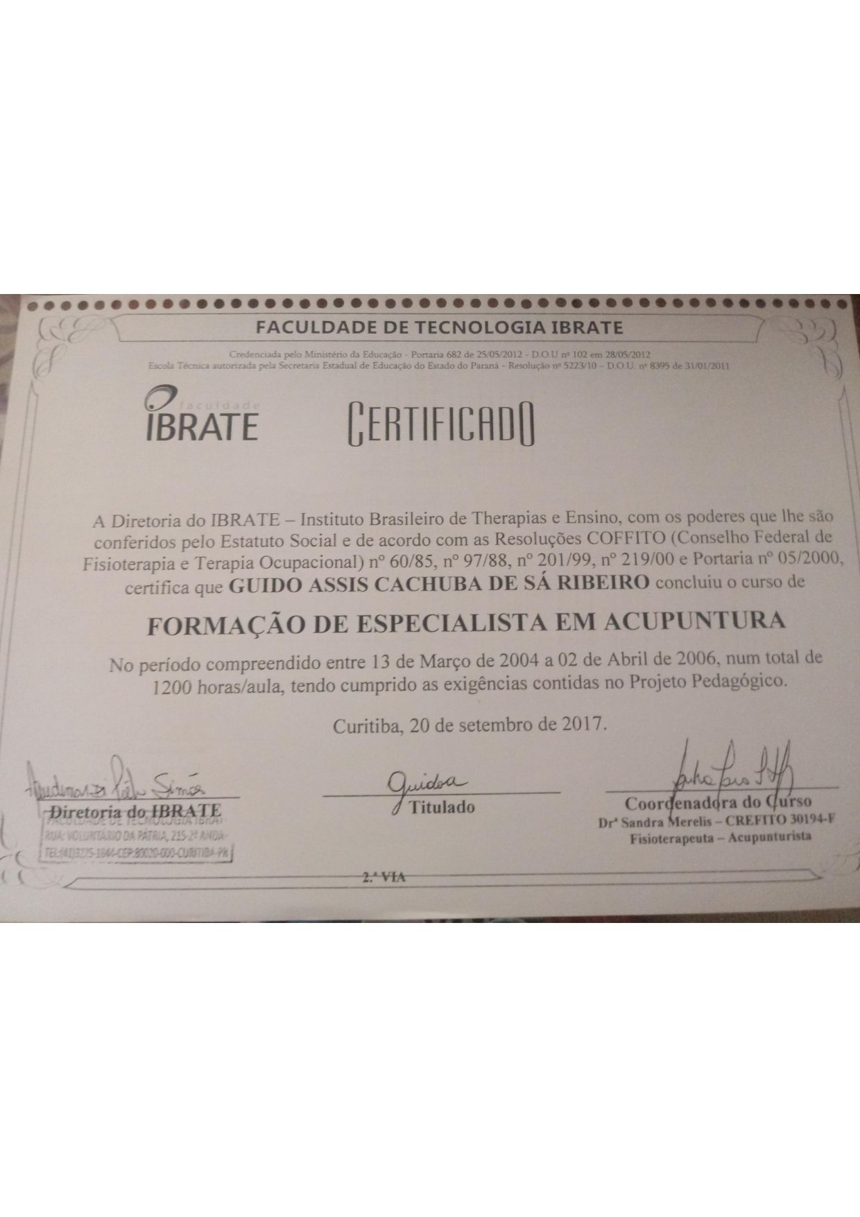 Quais são as principais especialidades de Guido Assis Cachuba de Sa Ribeiro?Guido Assis Cachuba de Sa Ribeiro é fisioterapeuta. Te mostramos alguns dos serviços oferecidos pelo especialista graças à sua trajetória e vasta experiência: Acupuntura, Fisioterapia, Fisioterapia pélvica, Quiropraxia.