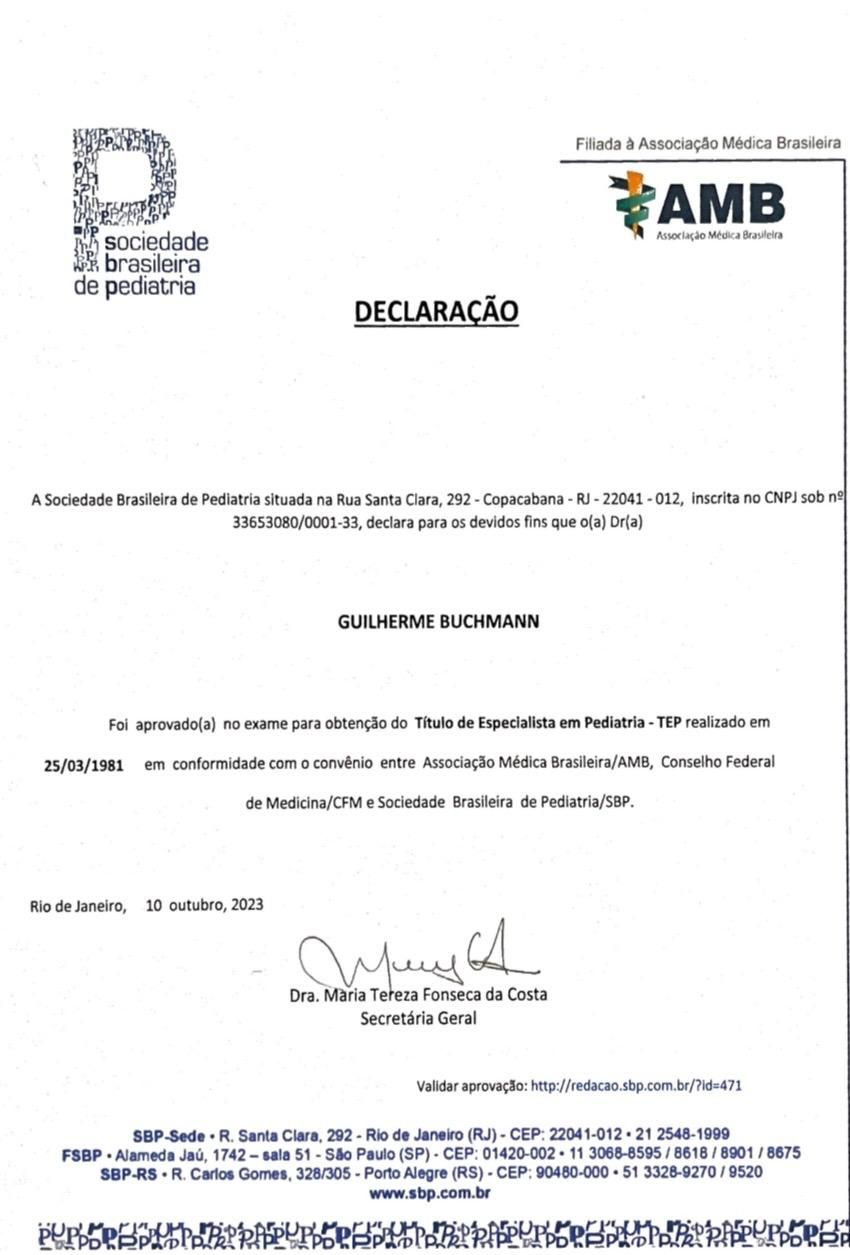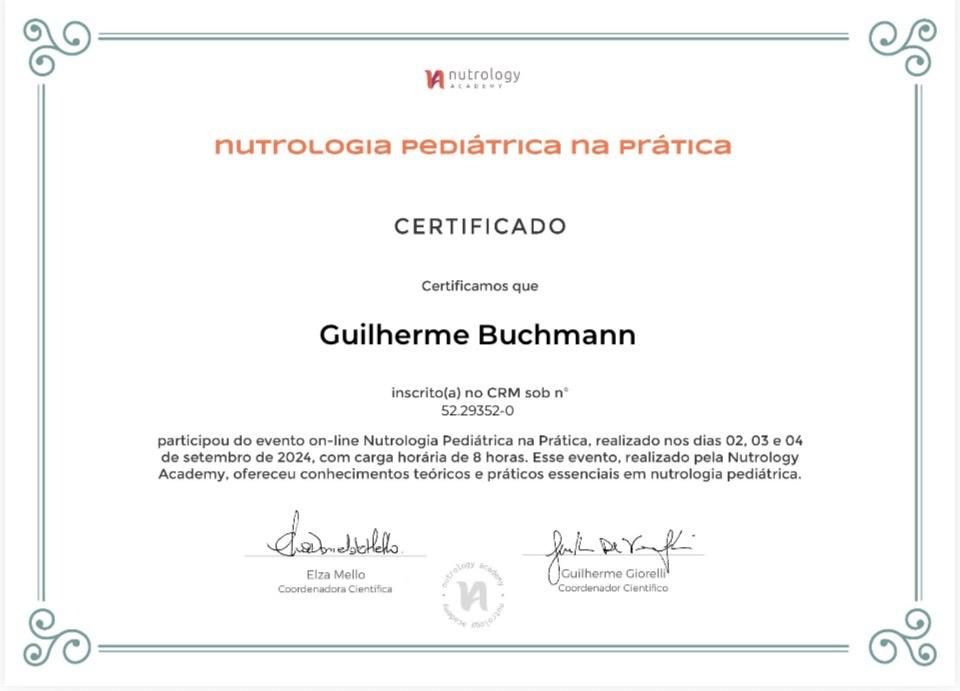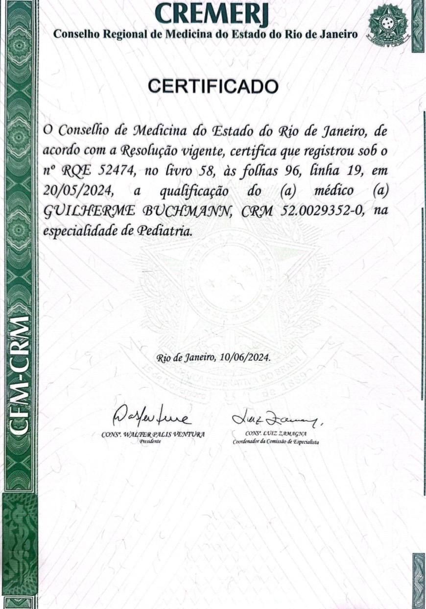 Quais são as principais especialidades de Guilherme Buchmann ?Guilherme Buchmann é pediatra. Te mostramos alguns dos serviços oferecidos pelo especialista graças à sua trajetória e vasta experiência: Primeira consulta Pediatria, Consulta Pediatria, Avaliação alimentar e nutricional, Consulta de puericultura (prevenção de doença, promoção de saúde e avaliação do crescimento e desenvolvimento), Introdução alimentar dos bebês, Atendimento integral ao recém nascido, Consulta pediatria.