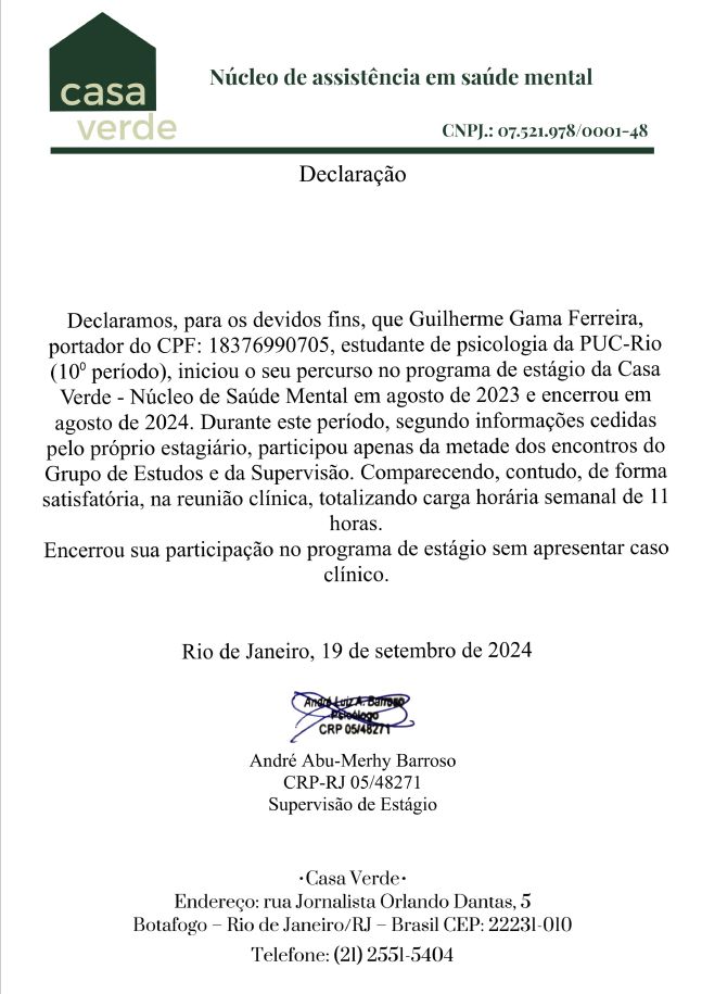Minha experiência inclui atendimentos em psicoterapia individual, tanto no âmbito privado quanto social, além de atuação em serviços de saúde mental.