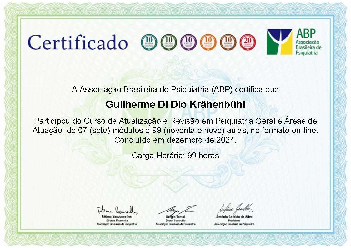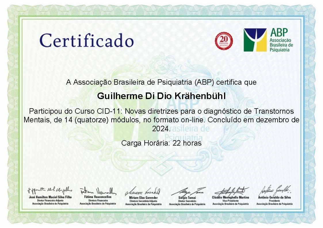Sou o Dr. Guilherme Krähenbühl, médico psiquiatra e intensivista. Minha atuação é pautada por uma visão integral do ser humano, unindo o rigor da medicina hospitalar à sensibilidade do cuidado psíquico. Formado pela FMABC, um dos maiores centros de excelência do país, ofereço um tratamento moderno e embasado nas melhores evidências científicas.