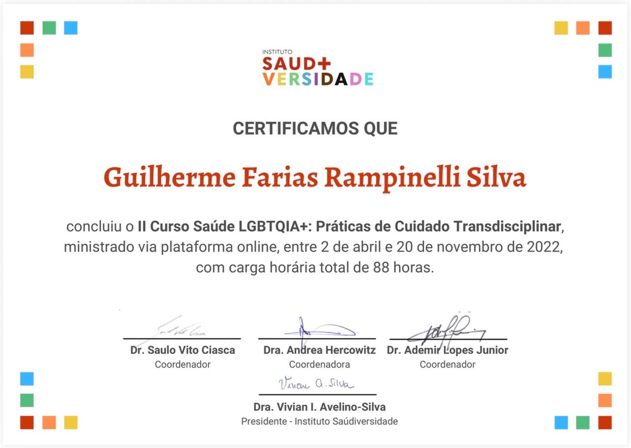 Olá, me chamo Guilherme Rampinelli, sou Médico Generalista formado pela Universidade Nove de Julho.