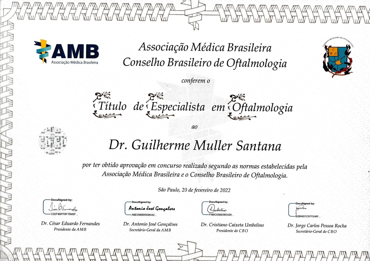 Quais são as principais especialidades de Guilherme Sant'Ana?Guilherme Sant'Ana é oftalmologista. Te mostramos alguns dos serviços oferecidos pelo especialista graças à sua trajetória e vasta experiência: Primeira consulta Oftalmologia, Cirurgia Do Pterigio, Cirurgia para correção de miopia, Implante do anel intraestromal corneano, Cirurgia de crosslinking, Cirurgia de catarata, Cirurgia refrativa (PRK), Transplante de córnea, Tratamento para Ceratocone, Cirurgia de catarata com lente premium.