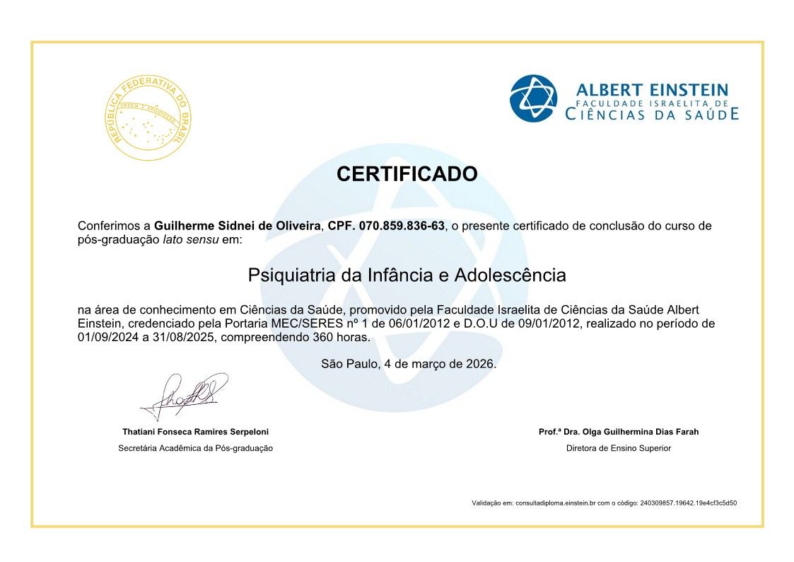 Quais são as principais especialidades de Guilherme Sidnei de Oliveira?Guilherme Sidnei de Oliveira é pediatra. Te mostramos alguns dos serviços oferecidos pelo especialista graças à sua trajetória e vasta experiência: Atendimento psiquiátrico de crianças e adolescentes, Consulta Pediatria, Primeira consulta do recém-nascido, Atendimento pediátrico a gestante no terceiro trimestre de gestação, Retorno de consultas Pediatria, Consulta de puericultura (prevenção de doença, promoção de saúde e avaliação do crescimento e desenvolvimento), Atendimento a criança doente, Atendimento a criança com febre, Tratamento de doenças infecciosas em pediatria, Consulta de orientação da amamentação.