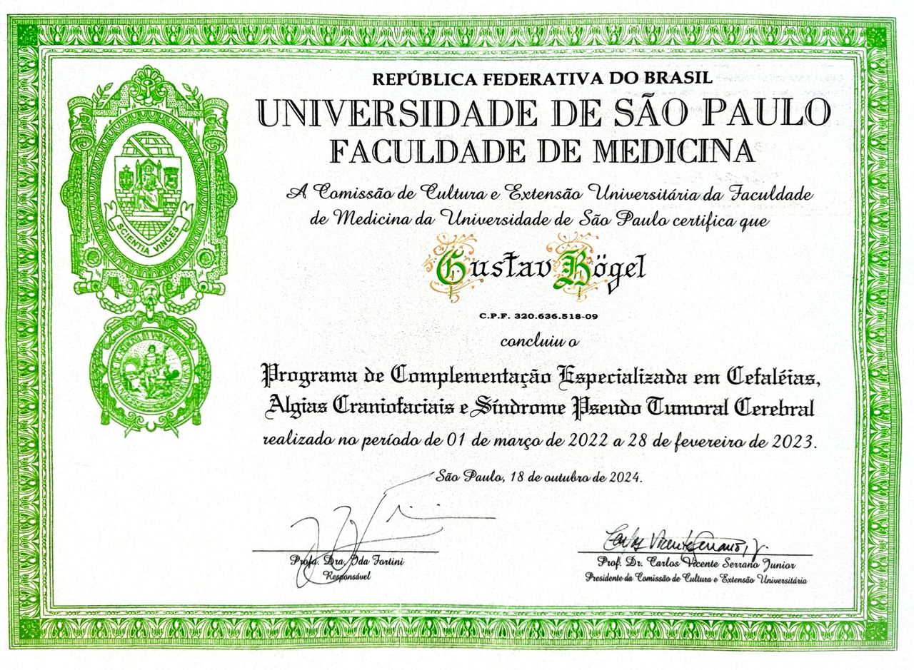 Realizei fellowship (especialização) em dores de cabeça e faciais no Hospital das Clínicas (HC) da USP, centro de referência nacional na área. Também possuo formação complementar em bloqueios neuromusculares com toxina botulínica pelo HC-USP, com foco no tratamento da enxaqueca crônica.