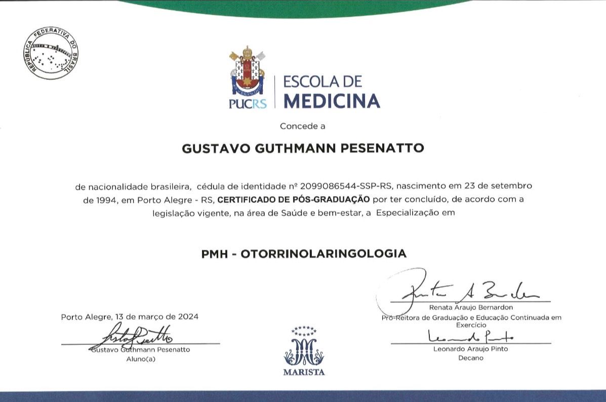 Quais são as principais especialidades de Gustavo Guthmann Pesenatto?Gustavo Guthmann Pesenatto é otorrino. Te mostramos alguns dos serviços oferecidos pelo especialista graças à sua trajetória e vasta experiência: Primeira consulta Otorrinolaringologia, Consulta Otorrinolaringologia, Retorno de consultas Otorrinolaringologia, Consulta de retorno, Videolaringoscopia, Septoplastia (Desvio Do Septo), Videonasofaringoscopia, Consulta particular, Frenectomia Labial, Sinusotomia Maxilar.