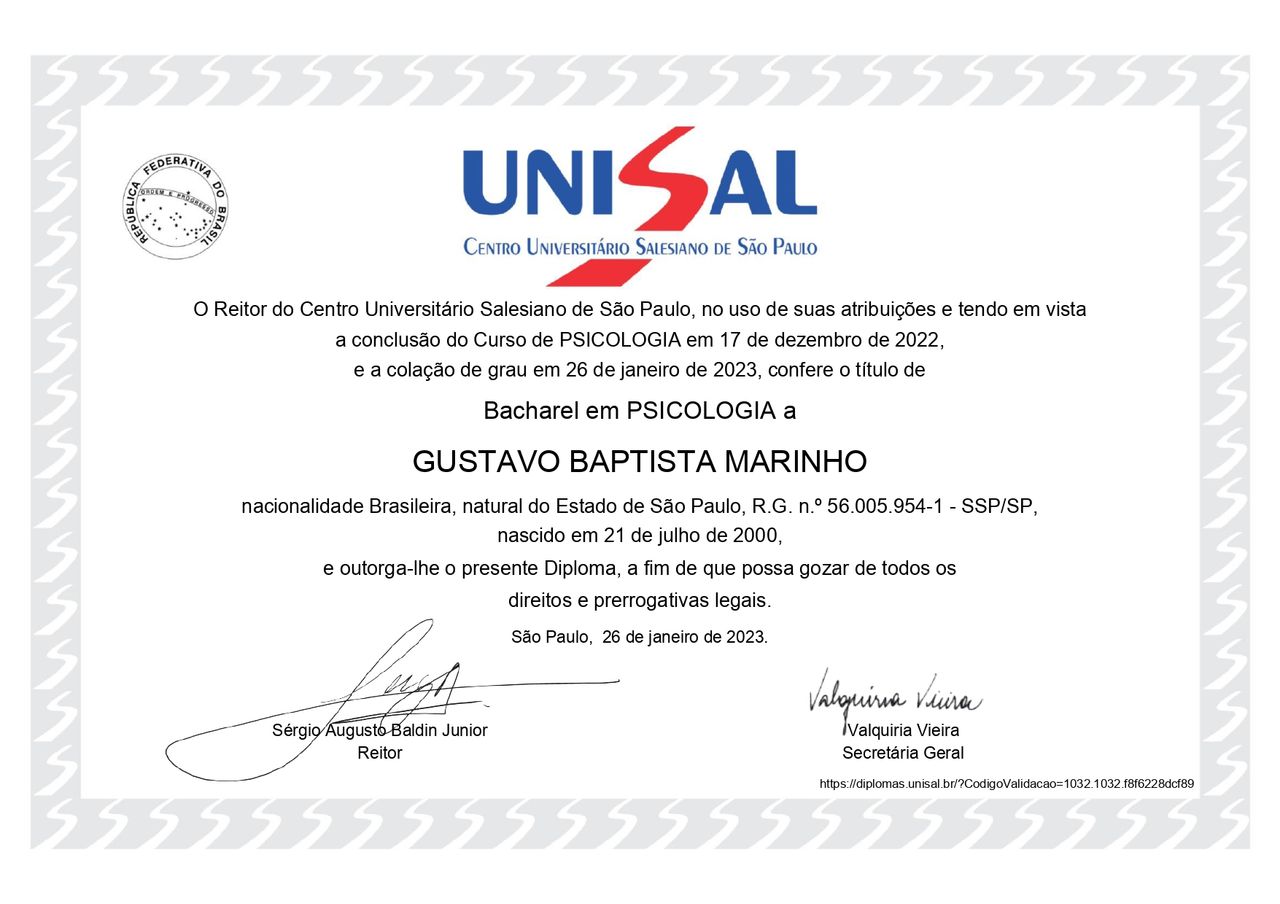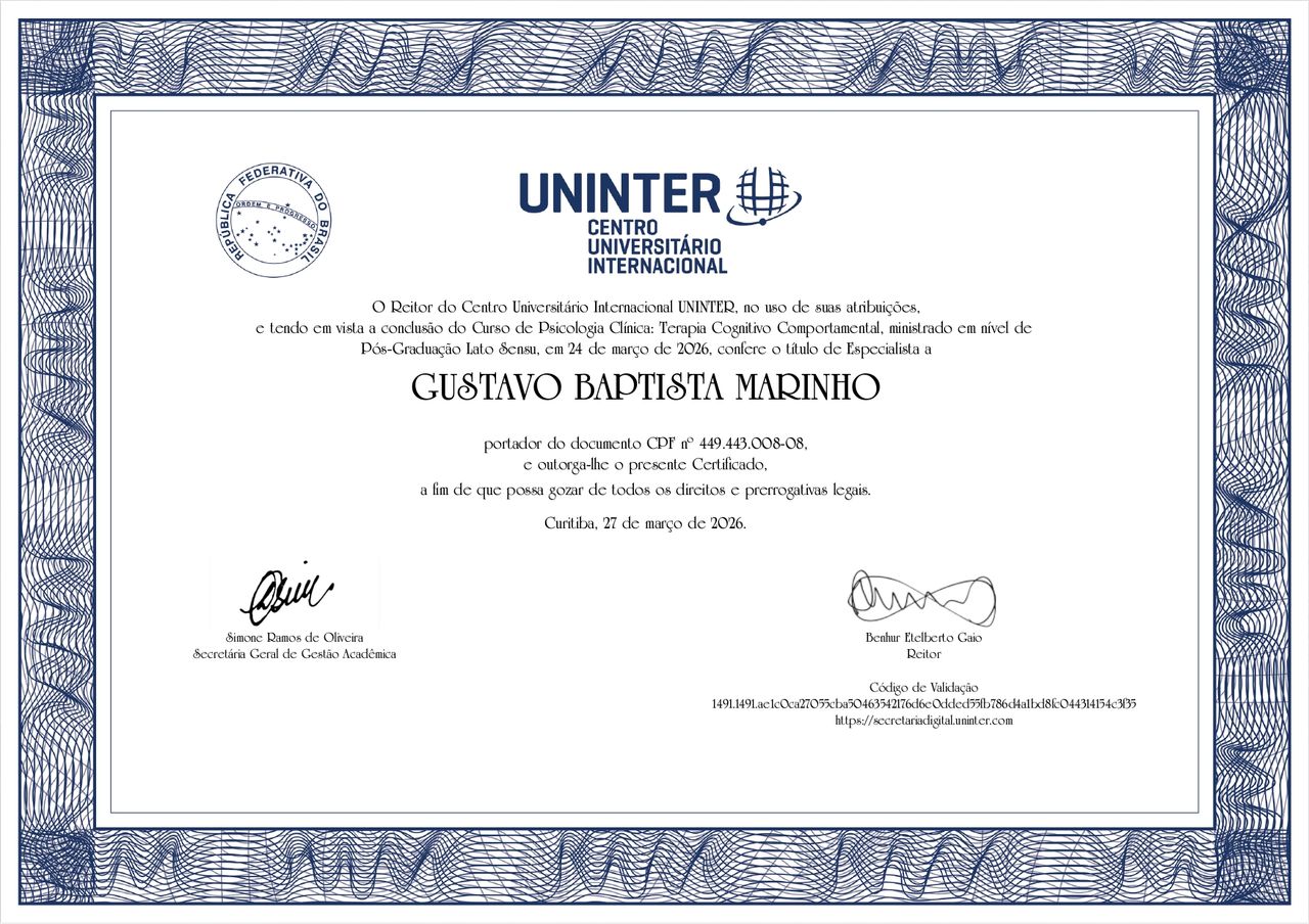 Graduado em Psicologia pela UNISAL – Centro Universitário Salesiano de São Paulo, possuo experiência no acompanhamento de demandas como ansiedade, estresse, autoestima, alterações de humor, conflitos emocionais, depressão, TDAH, TOC, fobia social, transtornos de personalidade (como borderline) e desenvolvimento pessoal.