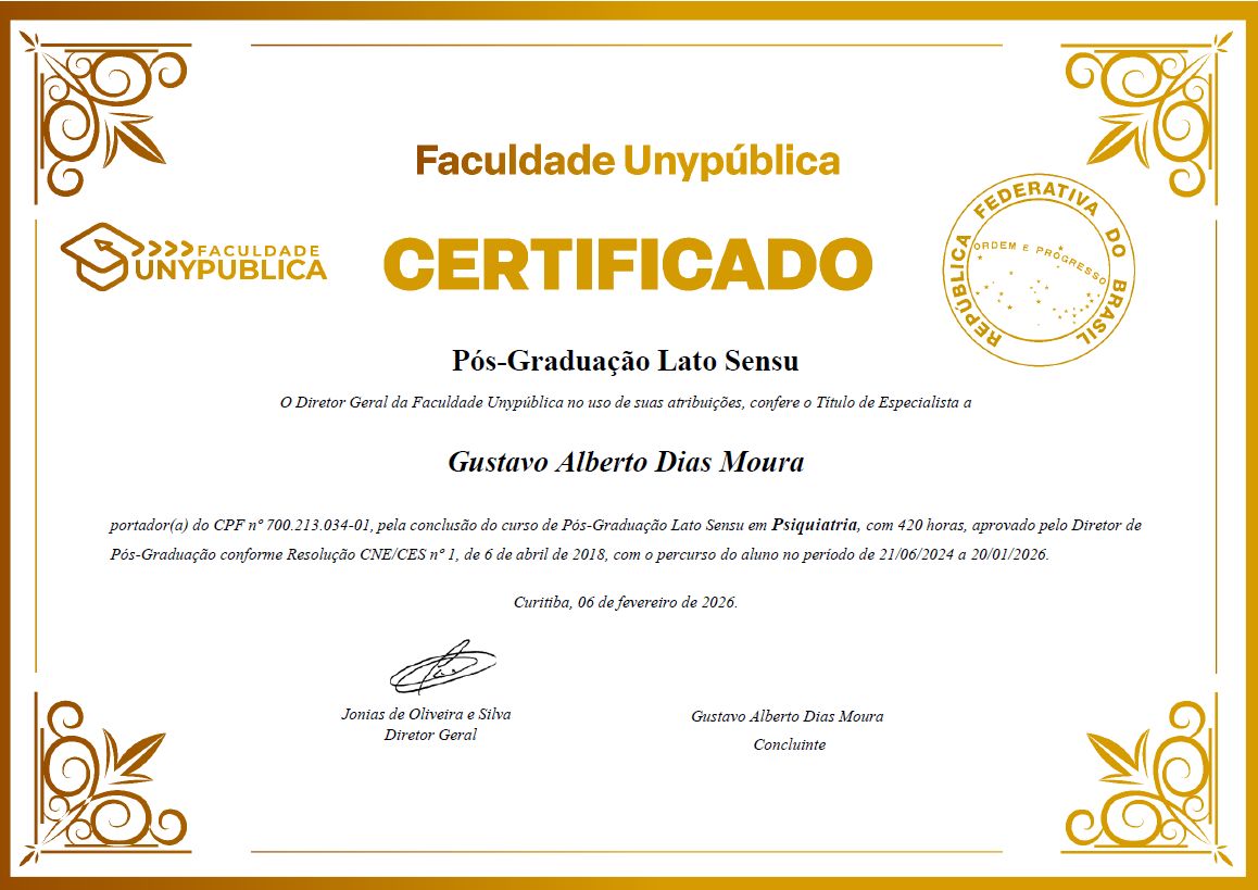 Quais são as principais especialidades de Gustavo Moura?Gustavo Moura é psiquiatra. Te mostramos alguns dos serviços oferecidos pelo especialista graças à sua trajetória e vasta experiência: Teleconsulta, Primeira consulta Psiquiatria.
