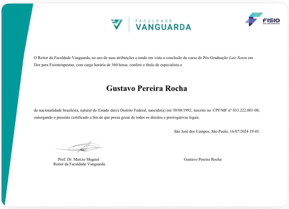 Quais são as principais especialidades de Gustavo Pereira Rocha?Gustavo Pereira Rocha é fisioterapeuta. Te mostramos alguns dos serviços oferecidos pelo especialista graças à sua trajetória e vasta experiência: Primeira consulta Fisioterapia.