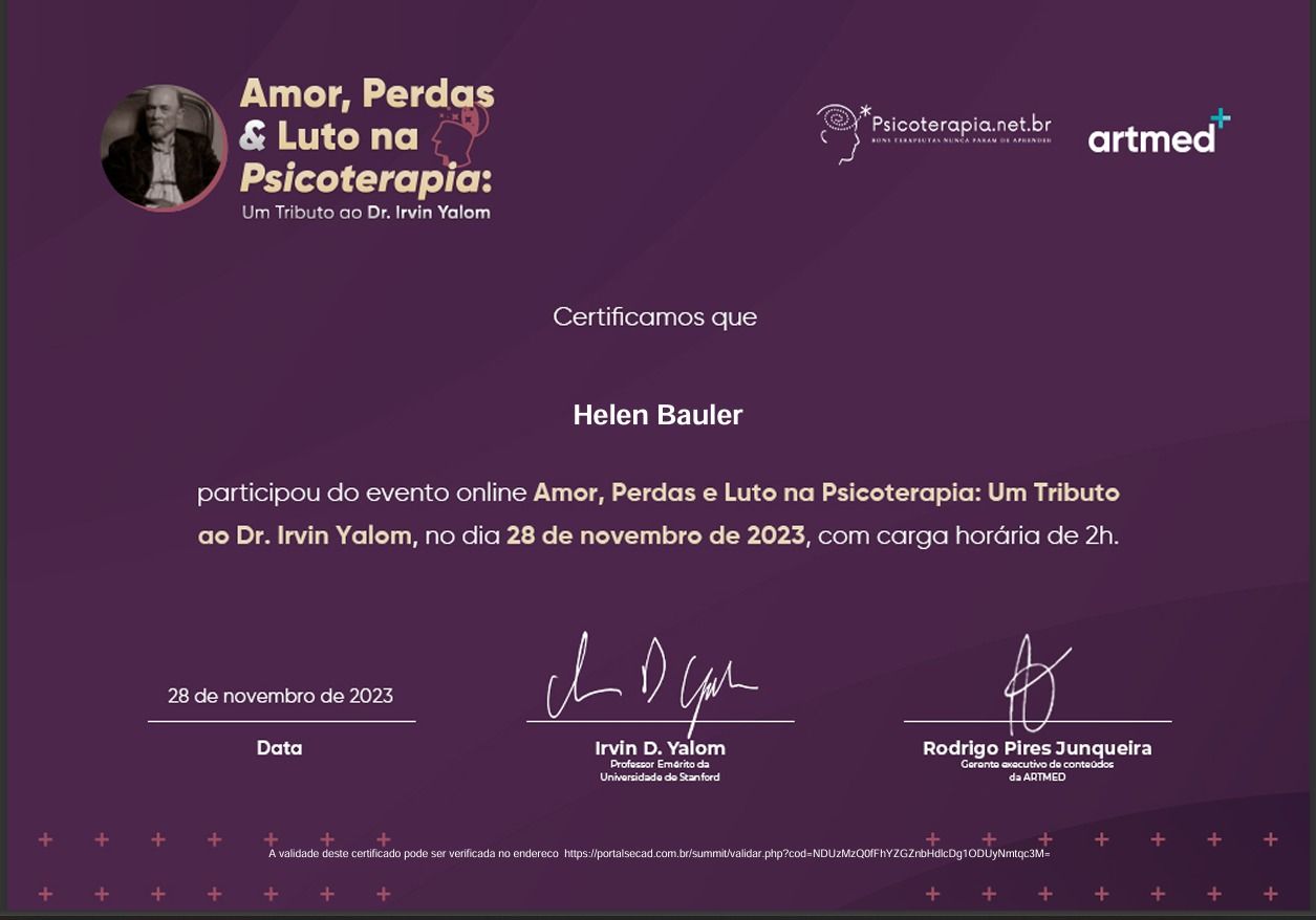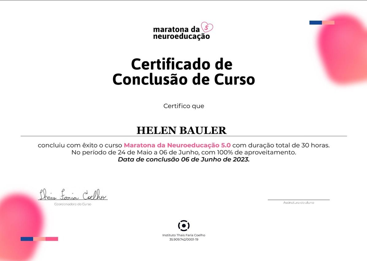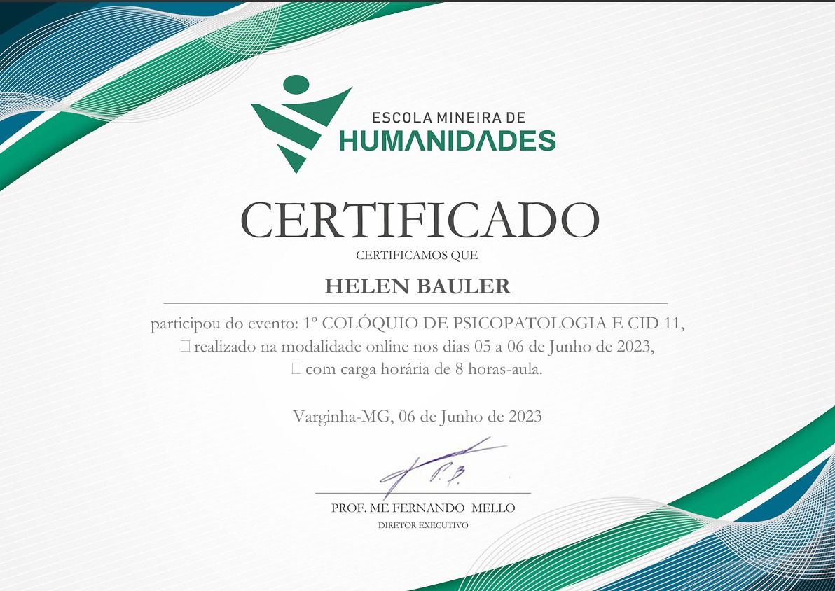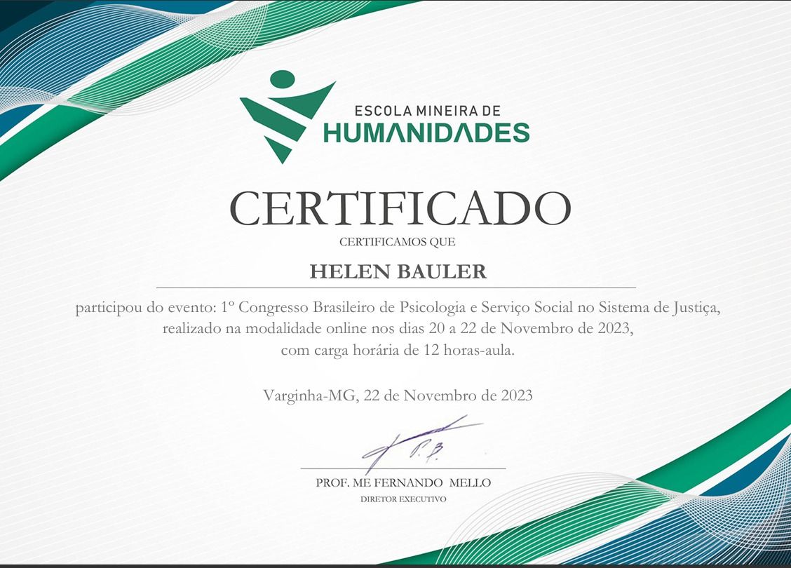 Acompanhei Helen durante a graduação. Pude perceber a profissional ética, acolhedora, empática e afetuosa em constante construção. Além da busca constante por conhecimento, sempre foi muito dedicada em aprimorar-se para dar o melhor de si ao estar com outra pessoa, ao cuidar dos sofrimentos e anseios muitas vezes demandados por atenção nos atendimentos. A Helen é mais que uma ótima profissional, orgulho de ter participado de todo o seu percurso!
