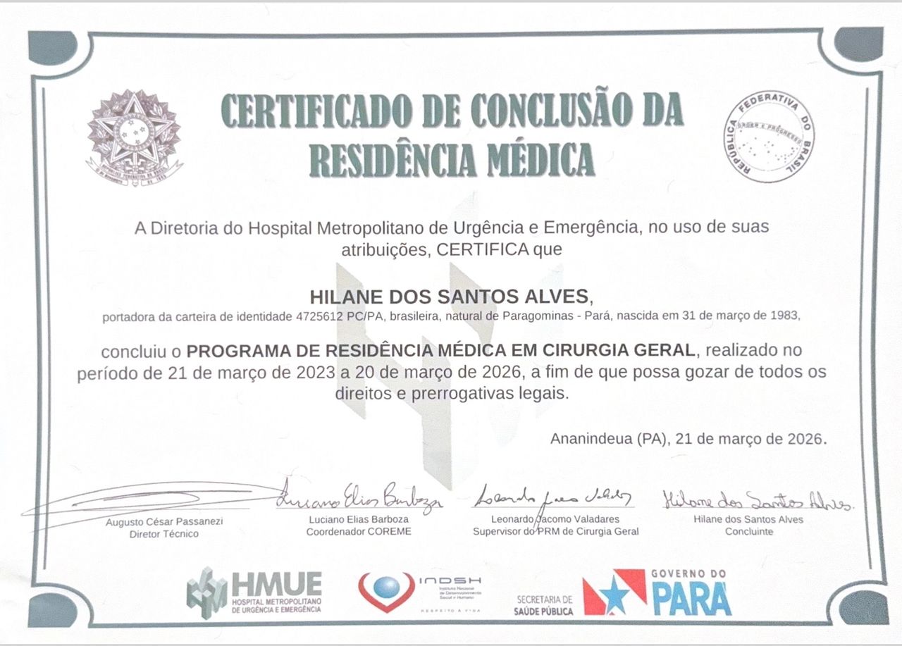 Sejam bem-vindos! Sou a Dra. Hilane Alves, graduada em Medicina pelo CESUPA e especialista em Cirurgia Geral pelo Hospital Metropolitano de Urgência e Emergência.
