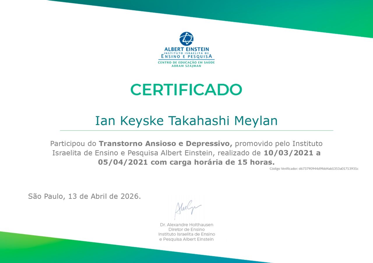 Posso passar por atendimento online com Ian Keyske Takahashi Meylan, sem ter que ir até o consultório?Sim, Ian Keyske Takahashi Meylan oferece atendimento online. Basta selecionar "Teleconsulta" ao agendar sua consulta e você poderá ver as datas e horários disponíveis.