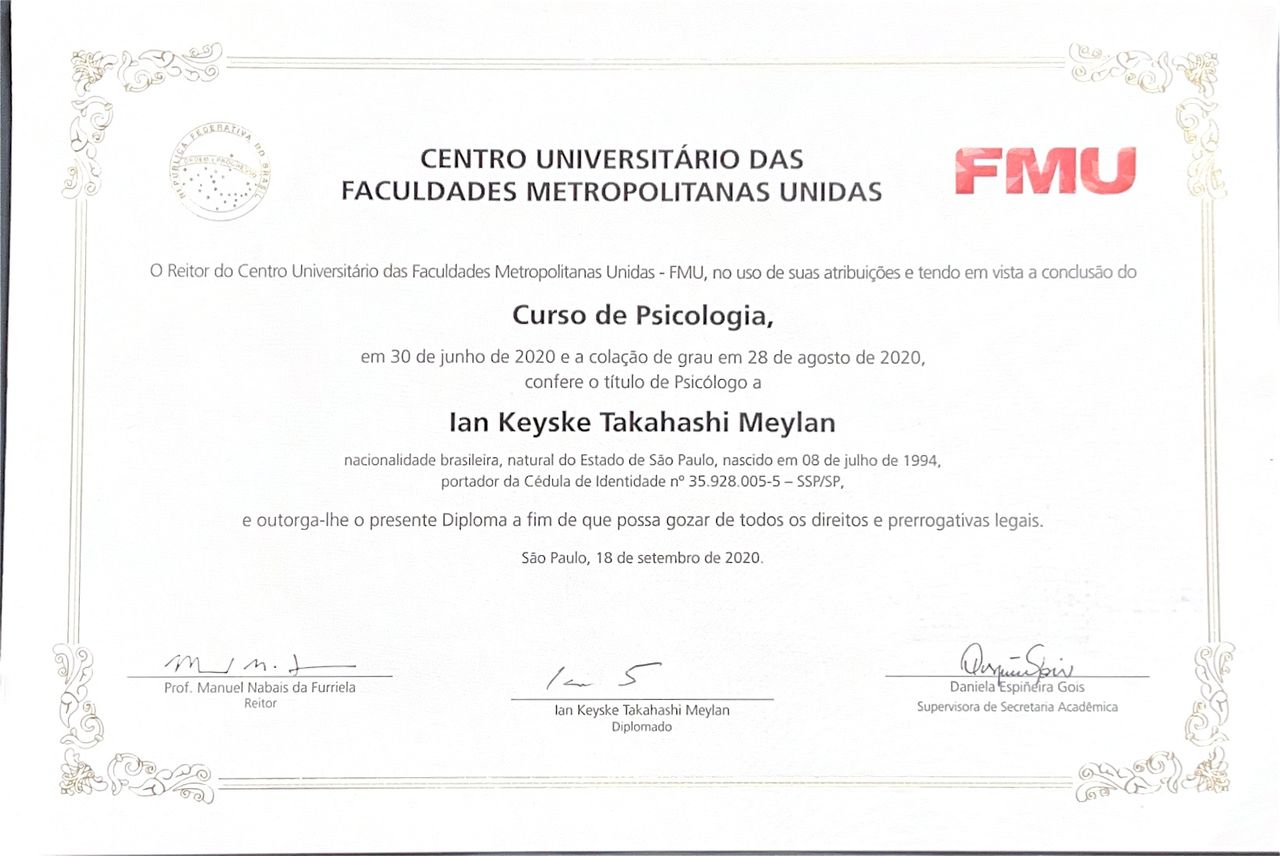 Quais são as principais especialidades de Ian Keyske Takahashi Meylan?Ian Keyske Takahashi Meylan é psicólogo. Te mostramos alguns dos serviços oferecidos pelo especialista graças à sua trajetória e vasta experiência: Atendimento psicológico online.