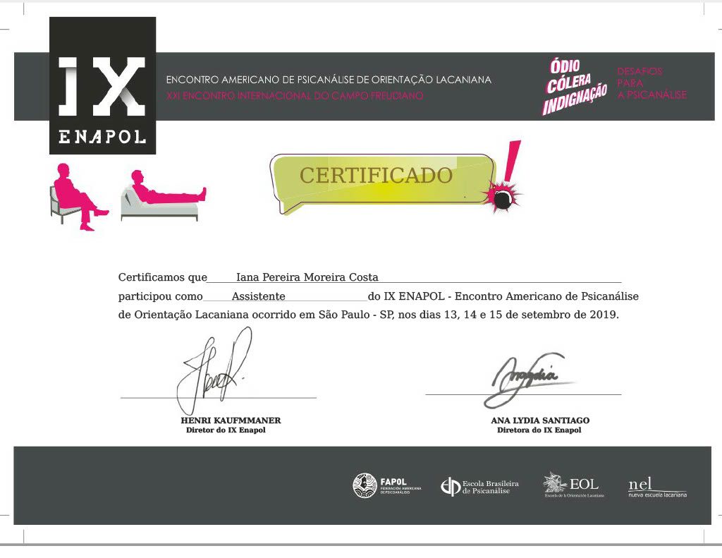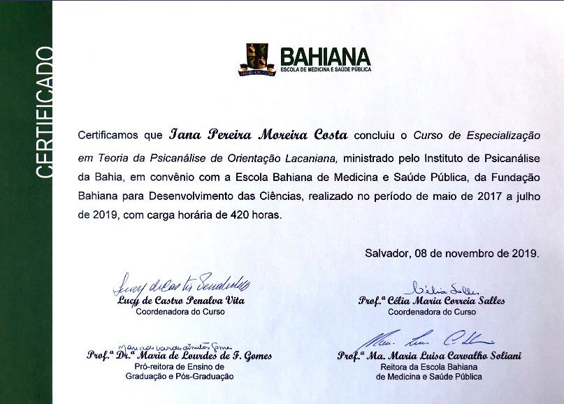 Graduada em Psicologia pela Faculdade Ruy Barbosa. Pós-Graduanda em Neuropsicologia pela Instituição IPOG. Especialista em Teoria da Psicanálise de Orientação Lacaniana pelo Instituto de Psicanálise da Bahia, sob a chancela da Escola Bahiana de Medicina e Saúde Pública. Possuo formação em atendimento infantil na abordagem psicanalítica pelo Instituto Viva Infância e atualmente curso Pós-graduação em Neuropsicologia pelo Instituto de Pós-Graduação e Graduação – IPOG.