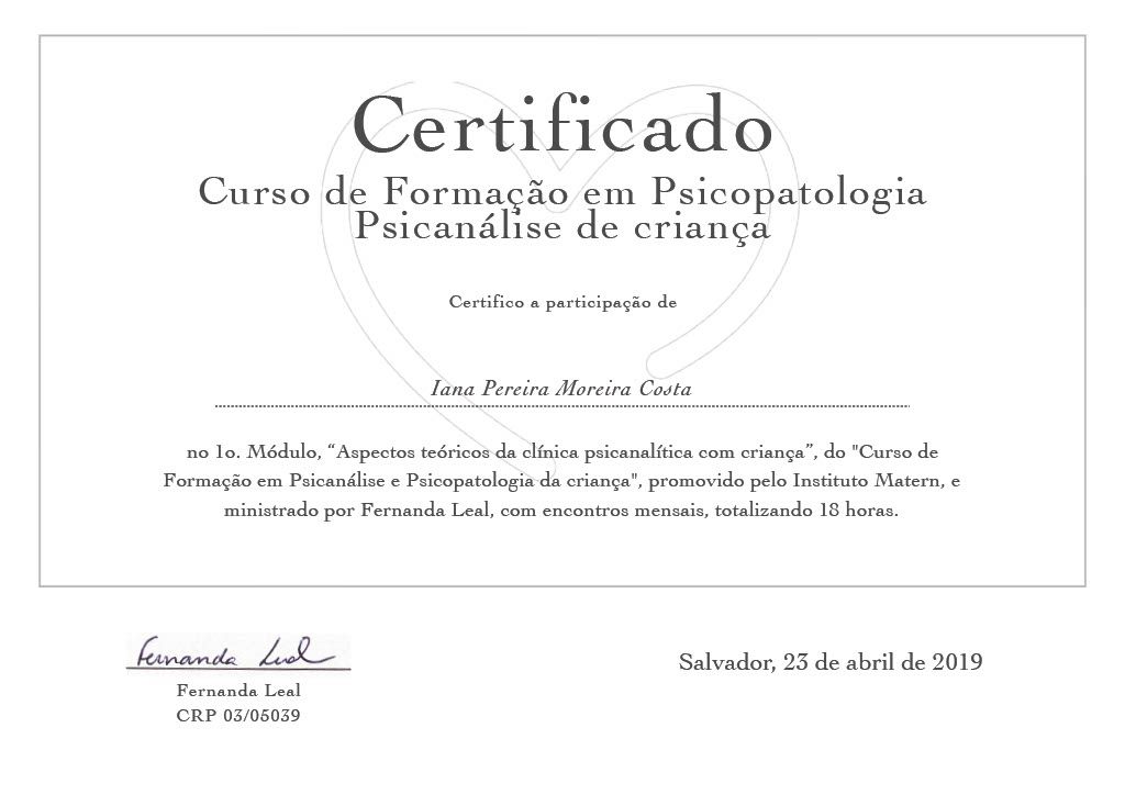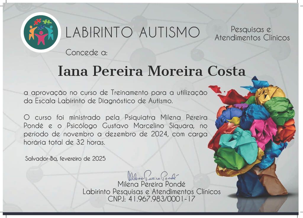 Tenho treinamento para utilização da Escala Labirinto de Diagnóstico de Autismo e formação em Psicanálise pela Escola Brasileira de Psicanálise (EBP-BA). Também possuo experiência em Psicologia no contexto hospitalar pelo HUPES (Hospital Universitário Professor Edgard Santos).