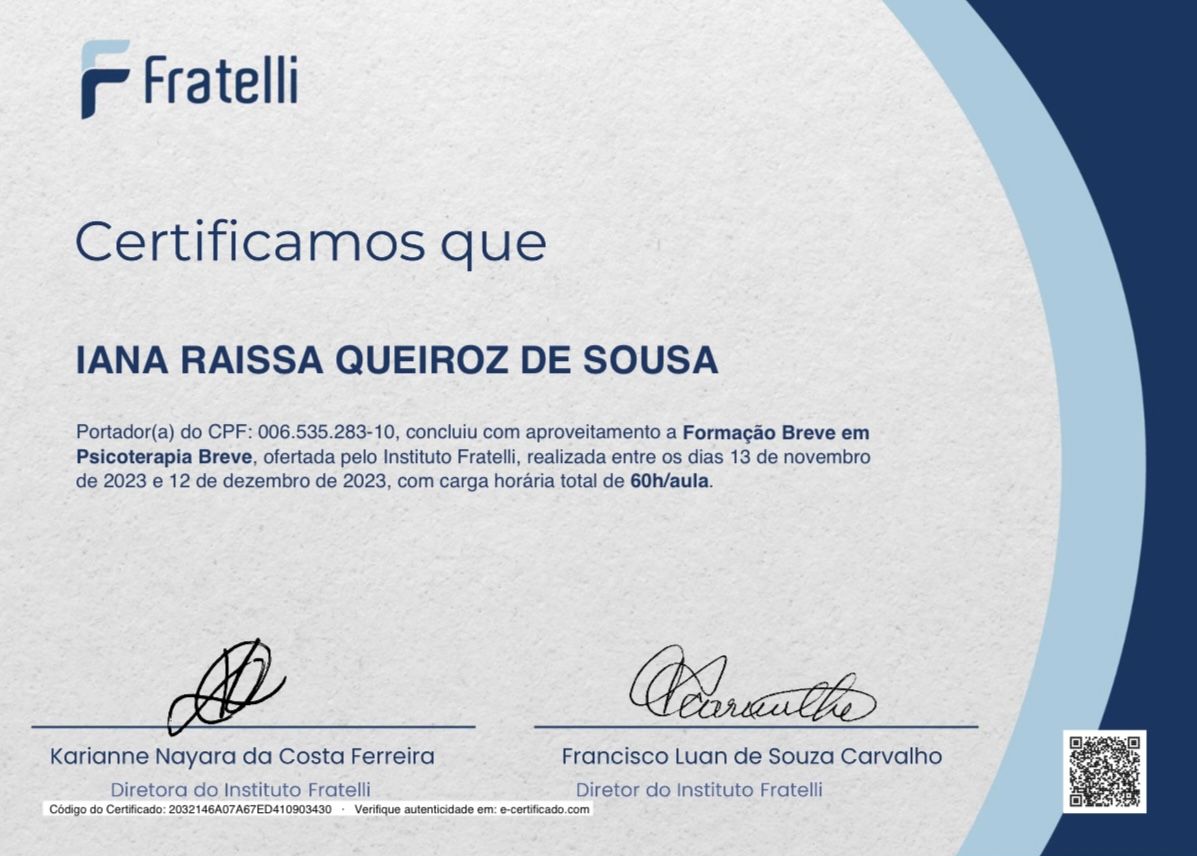 Quais são as principais especialidades de Iana Queiroz?Iana Queiroz é psicóloga. Te mostramos alguns dos serviços oferecidos pelo especialista graças à sua trajetória e vasta experiência: Teleconsulta, Psicoterapia adulto, Psicoterapia para idosos, Psicoterapia Psicanalítica, Tratamento para dificuldade em relacionamentos familiares, Terapia sobre queixas ligadas a relacionamentos amorosos, Psicoterapia para homens, Acompanhamento psicológico para mulheres, Psicoterapia para pacientes em fase de luto, Tratamento para insegurança.