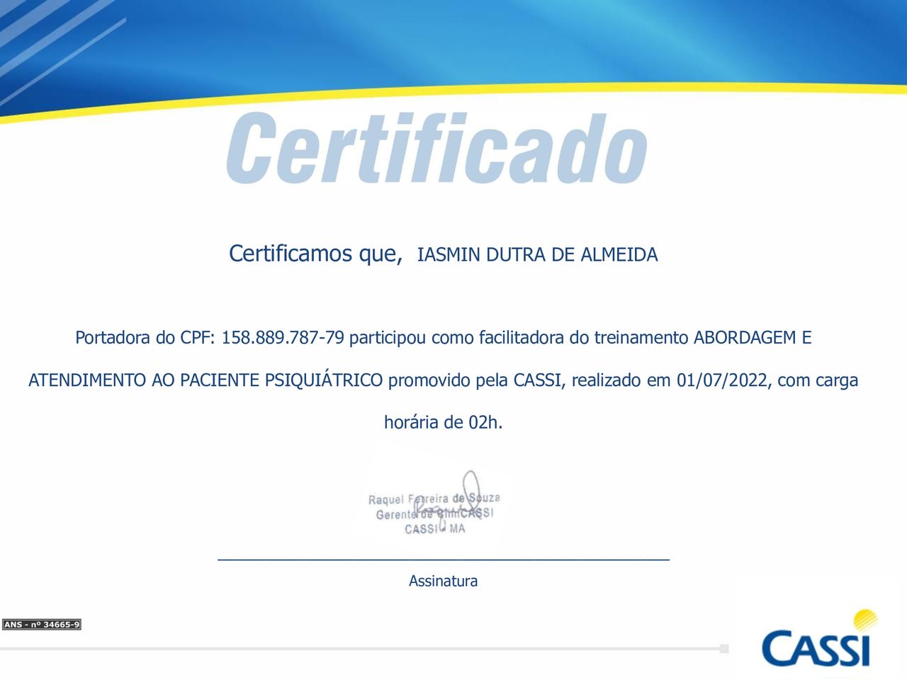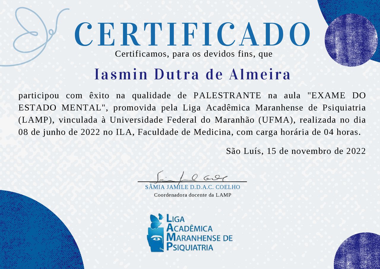 Quais são as principais especialidades de Iasmin Dutra de Almeida?Iasmin Dutra de Almeida é generalista. Te mostramos alguns dos serviços oferecidos pelo especialista graças à sua trajetória e vasta experiência: Teleconsulta, Retorno de consulta (dentro de 30 dias), Consulta generalista, Atendimento em saúde mental, Check up, Consulta de psiquiatria, Primeira consulta generalista, Check-up Preventivo, Consulta de rotina, Consulta médica.