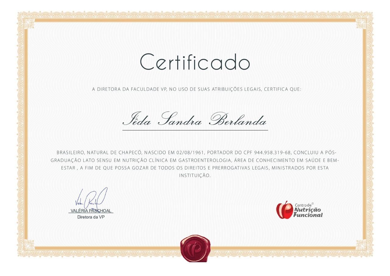 Em 2014, conclui a Graduação em Nutrição, também pela Unochapeco e até então venho atuando com a nutrição Preventiva, Clinica e Funcional. Em 2017 à 2019, realizei uma Pós Graduação em "Adequação Nutricional e Manutenção da Homeostase - Prevenção e Tratamento de doenças relacionadas à idade", ministrado pelo Professor Dr. Lair Ribeiro com um riquíssimo conhecimento. Em 2020, participei de mais um curso com o Brilhante Professor Murilo Pereira sobre Formação em Modulação Intestinal, com duração de 4 meses. Em setembro de 2020, iniciei mais um curso sobre Suplementação na Prática Clínica, com a Dra. Denise Carreiro, com duração de 50hs aulas. Abordagem Nutricional Nos Transtornos Do Neurodesenvolvimento, com Dra Denise Carreiro, com 15 hs. aula. Cirurgia Bariátrica, Abordagem Nutricional Na Prática Clínica, com Dra Denise carreiro 5 hs aula. Pós Graduação em andamento Oncologia Nutricional e Clínica Integrativa, pela Fapes/Medicina, inicio em 2022 com duração de 18 meses. Sigo buscando o melhor conhecimento para que meu trabalho realizado em consultório seja o melhor entregue ao meu paciente.