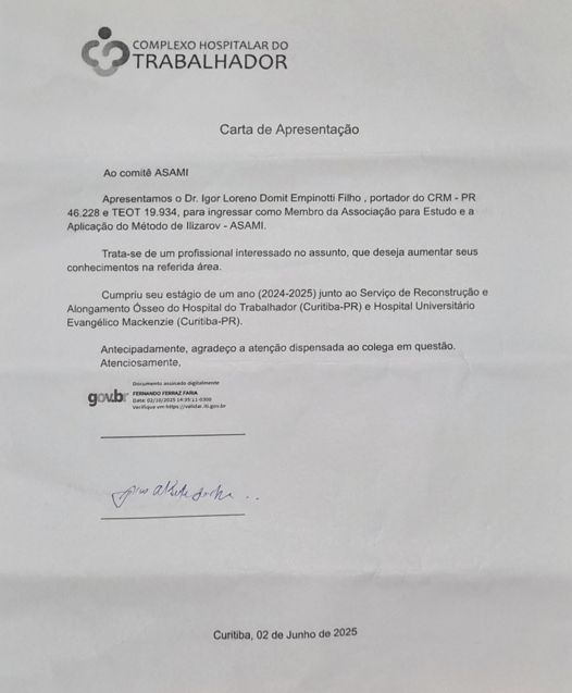 Sou médico ortopedista e traumatologista, especializado em reconstrução e alongamento ósseo. Minha formação acadêmica e clínica foi construída em centros de referência no Brasil e no exterior. Formado pela Universidade Federal de Santa Catarina, fiz residência no Hospital Evangélico Mackenzie de Curitiba e fellowship no Hospital do Trabalhador, onde aprofundei minha atuação em infecções e deformidades ósseas, alongamento e alinhamento dos membros.