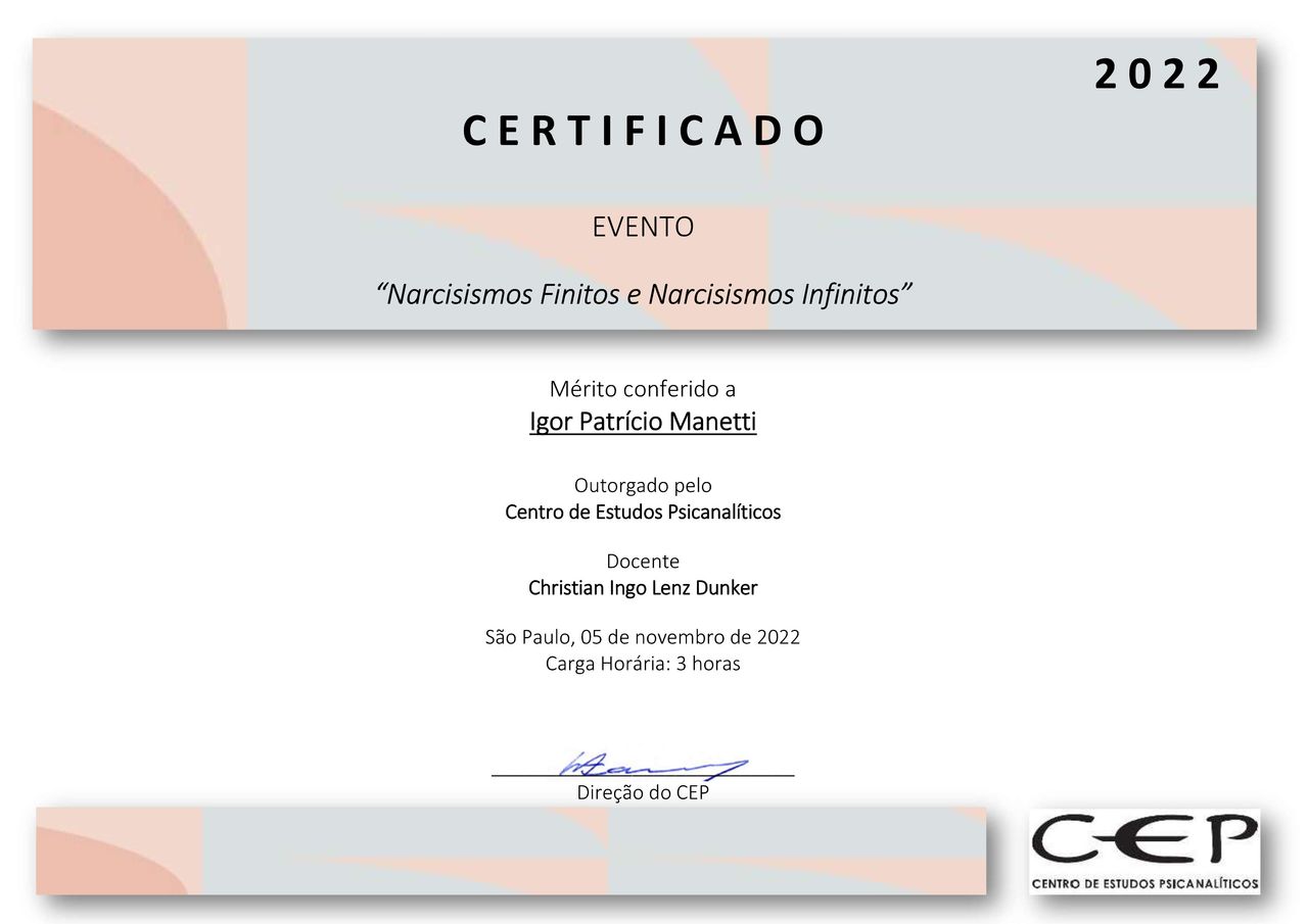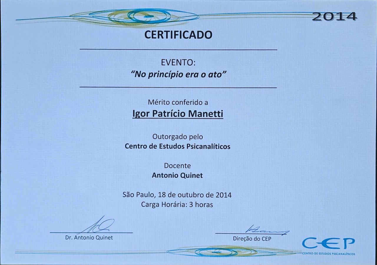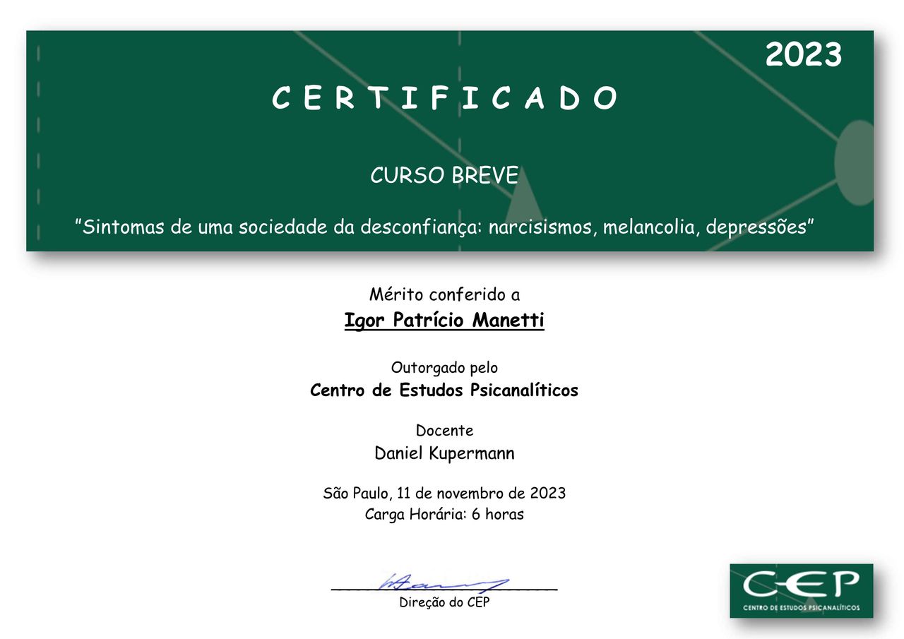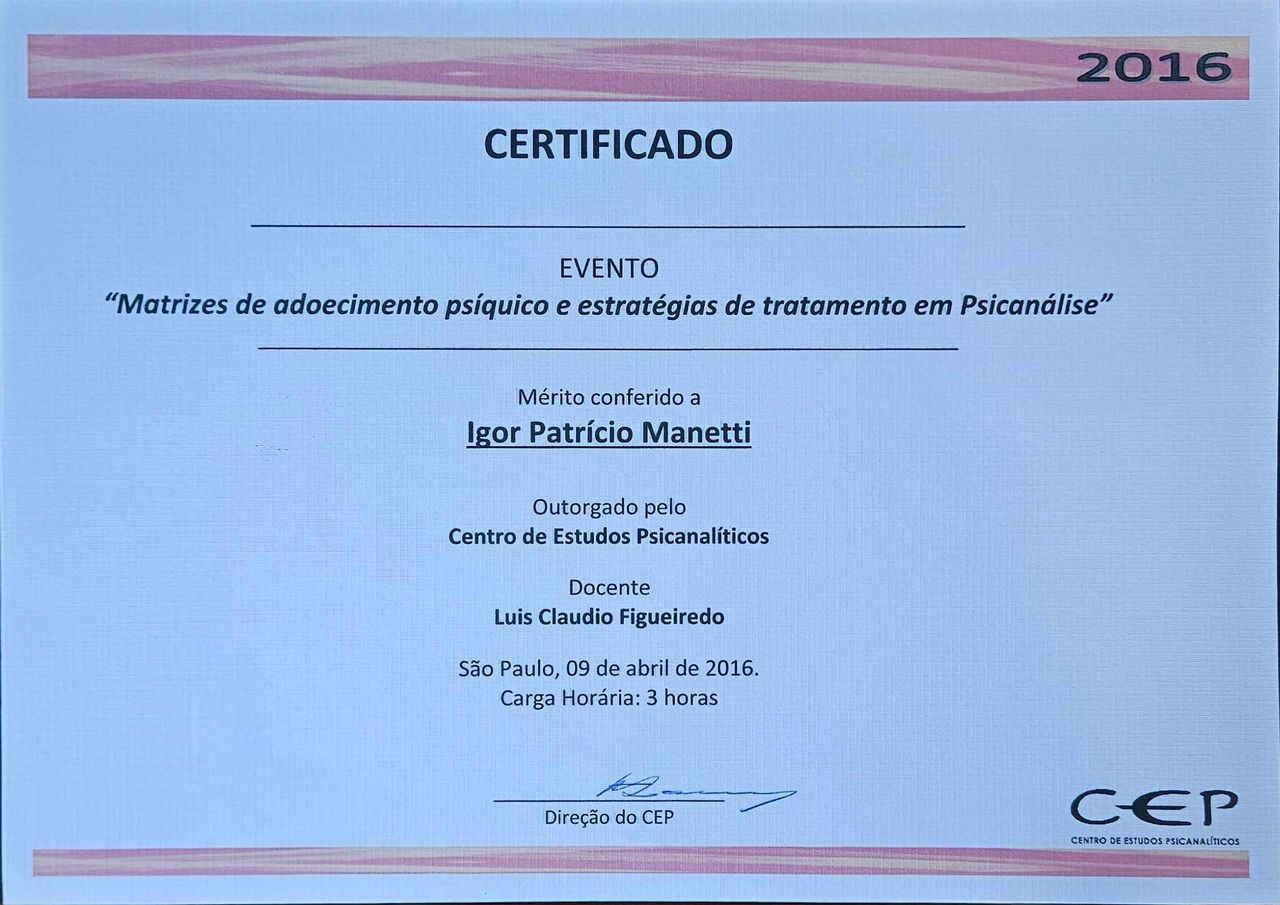 Quais são as principais especialidades de Igor Patricio Manetti?Igor Patricio Manetti é psicólogo, psicanalista. Te mostramos alguns dos serviços oferecidos pelo especialista graças à sua trajetória e vasta experiência: Consulta Psicologia, Primeira consulta psicologia, Psicoterapia Psicanalítica, Psicoterapia de orientação psicanalítica, Psicoterapia adulto, Psicoterapia para idosos, Tratamento da depressão, Tratamento da ansiedade, Tratamento do luto, Psicanálise.