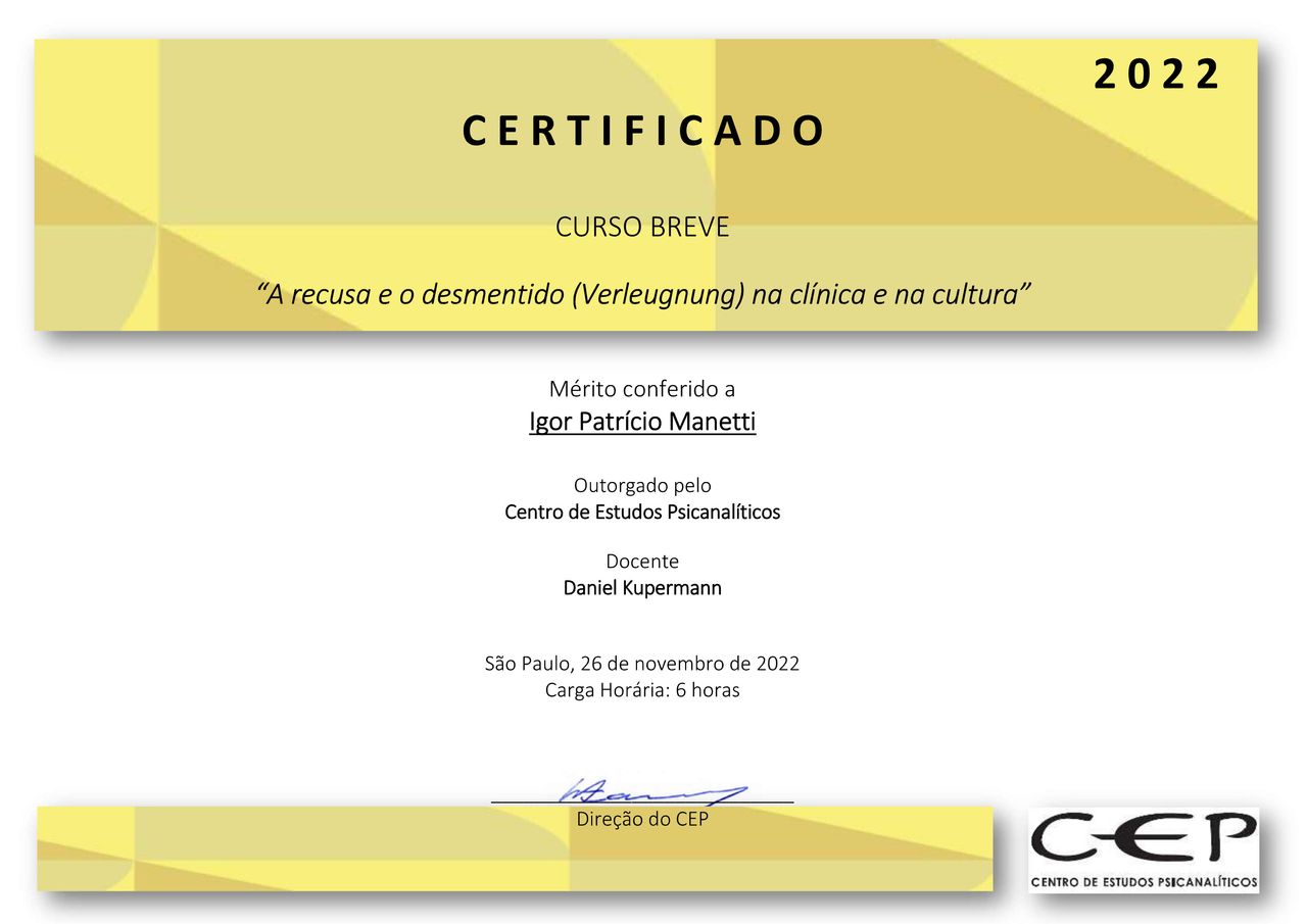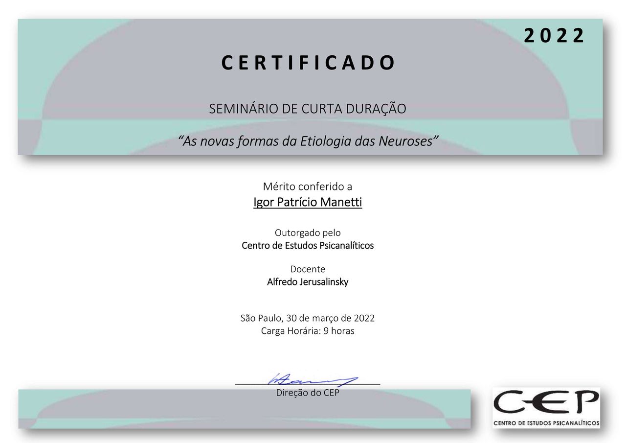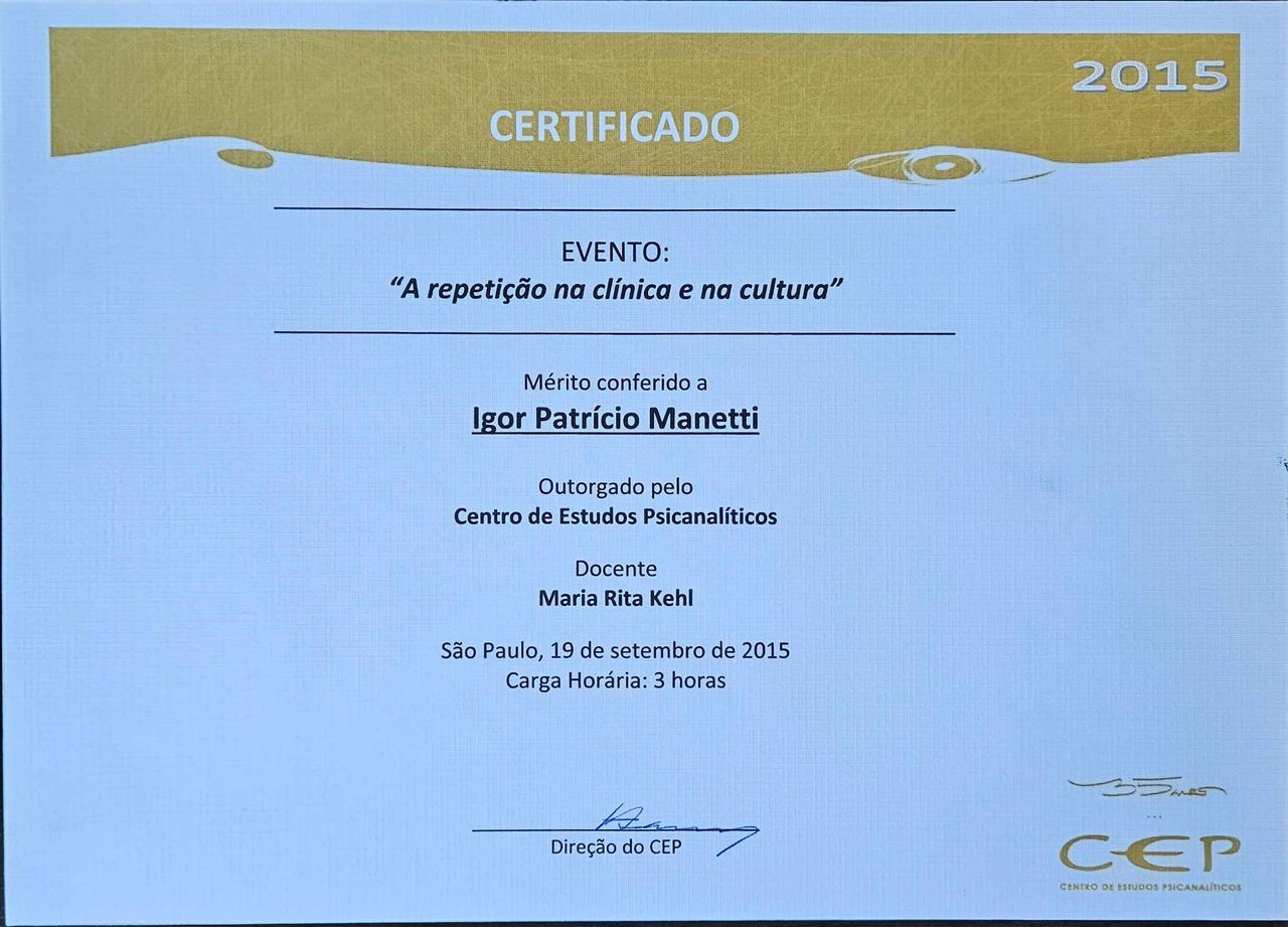 Quando poderia me consultar com Igor Patricio Manetti?Igor Patricio Manetti costuma ter horários disponíveis dentro da mesma semana ou para a semana seguinte. Verifique o calendário: você verá o primeiro horário disponível, atualizado em tempo real. Caso o horário sugerido não funcione para você, verifique outras datas. Agendar uma consulta é sempre imediato e gratuito.