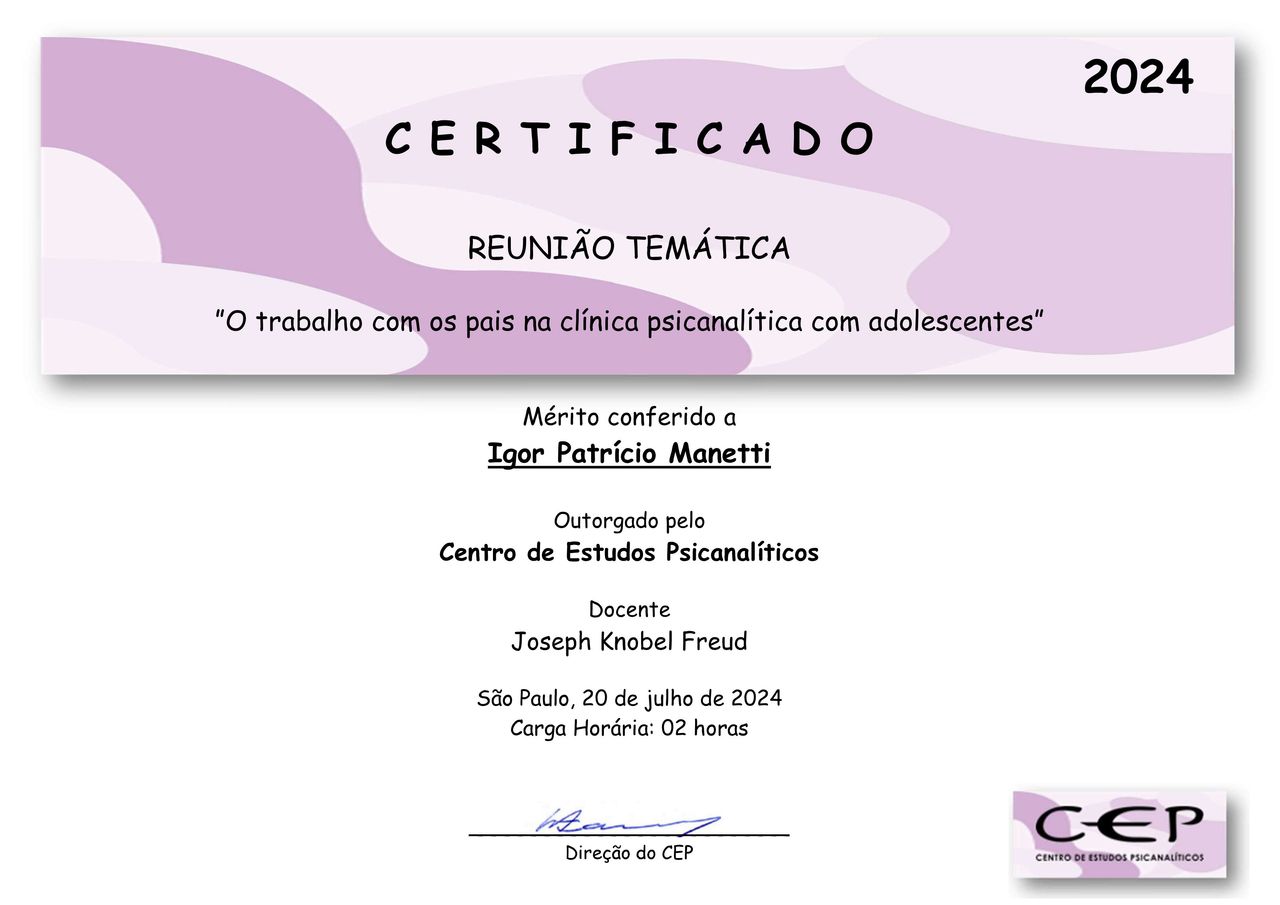 Ótimo trabalho, demonstrando uma postura coerente com sua abordagem e ética. Pontual e atencioso durante as sessões, recordando e retomando pontos importantes.