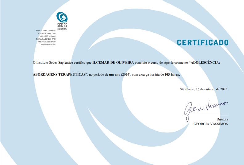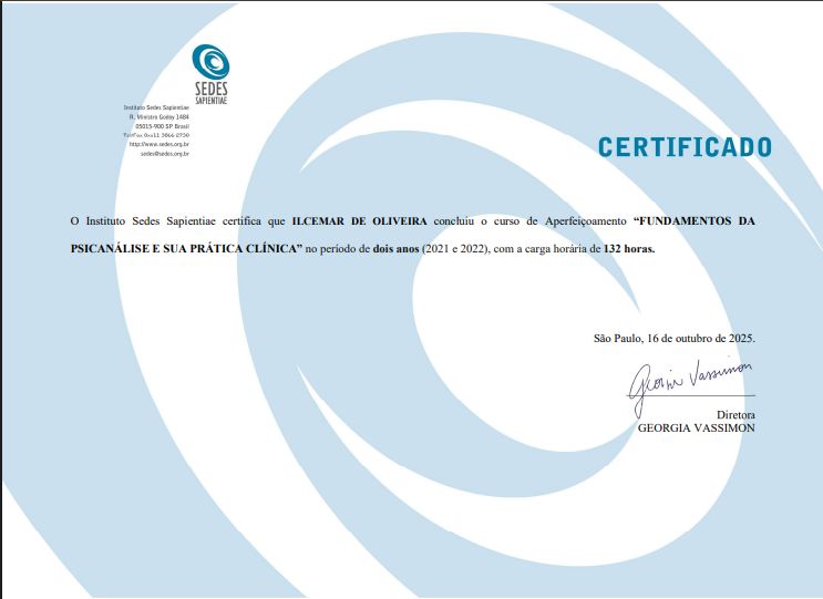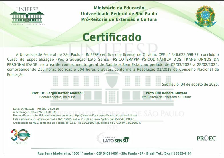 Sou formado pela Universidade Cruzeiro do Sul, com especialização em psicopatologia de orientação psicanalítica, e também especialista em Transtornos da Personalidade pela UNIFESP. Atualmente, curso Formação em Psicanálise no Instituto Sedes Sapientiae, onde integro o departamento de formação e realizei mais de 700 horas de atendimento clínico supervisionado.
