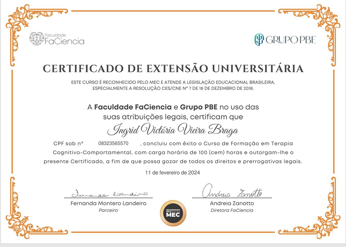Sou psicóloga clínica, atendo com as terapias Analítico Comportamental (TAC) e Terapia Comportamental Dialética (DBT). Possuo formação em Terapia Cognitivo Comportamental. Fui cofundadora do projeto de extensão, a Liga Acadêmica de Estudos sobre Morte e Luto (LAEMLu) onde contribuí para estudos, pesquisas e eventos sobre essas temáticas, que contribuíram para minha experiência atendendo essas questões. Realizo avaliação para transtornos mentais, com um foco particular em fornecer tratamentos e cuidado em saúde mental. Meu trabalho é impulsionado pelo desejo de ajudar os outros a alcançar uma compreensão mais profunda de si mesmos e superar desafios pessoais.